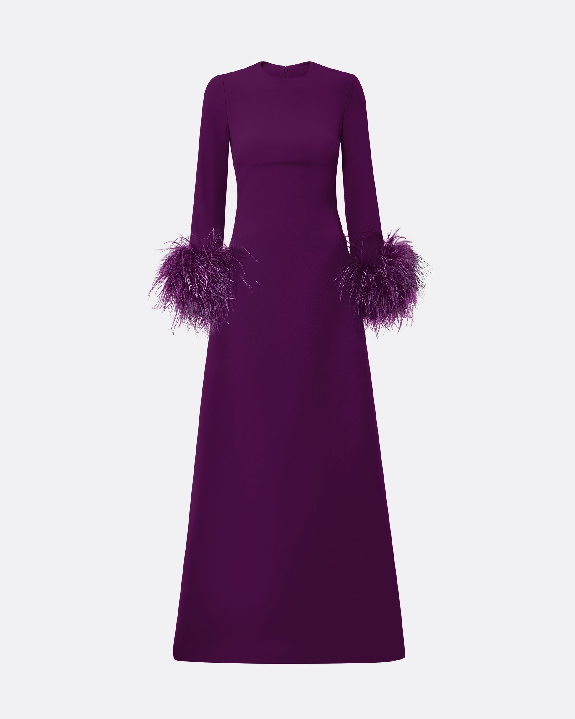 A-line gown with long sleeves in currant Heavy Crepe and Ostrich Feather.