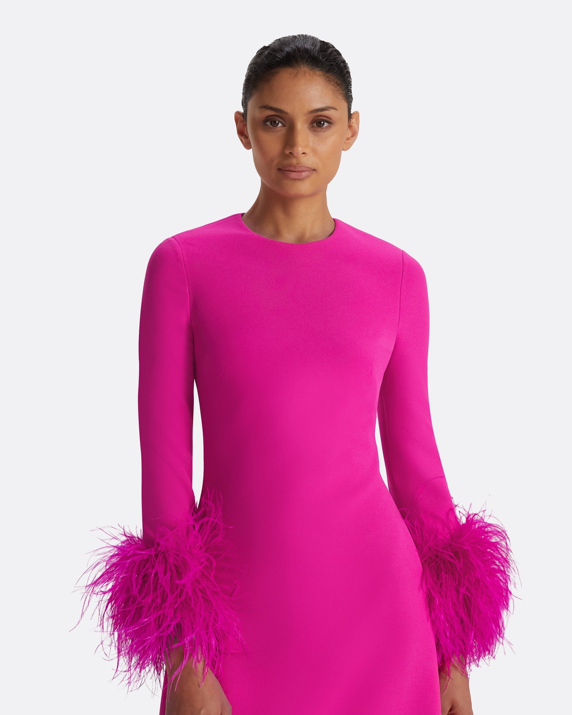 A-line gown with long sleeves in wild strawberry Heavy Crepe and Ostrich Feather.