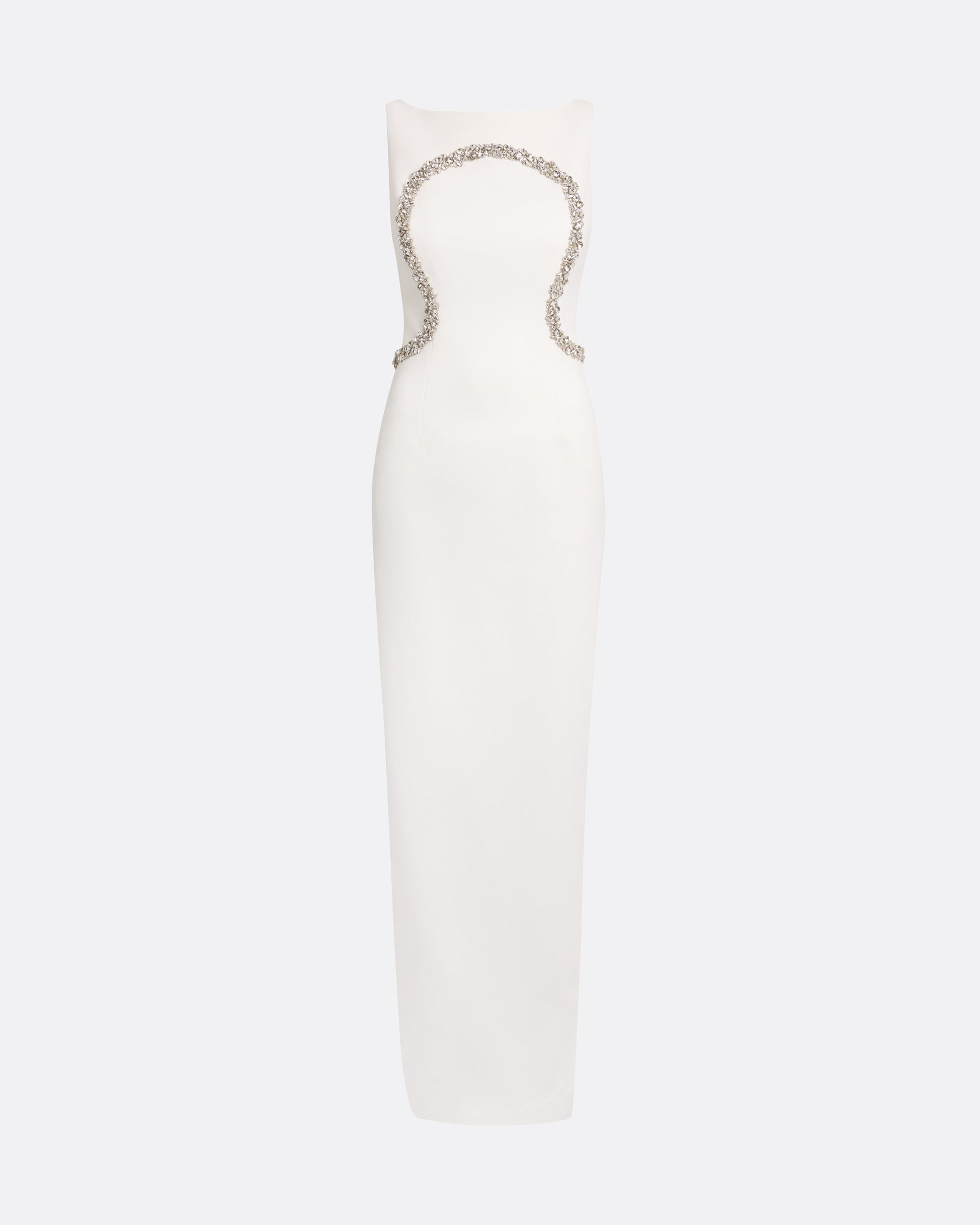 From the Resort '26 collection, the Riley gown in ivory embodies sculpted clarity. Its pared-back design is elevated with a crystalline finish that catches the light with deliberate subtlety.