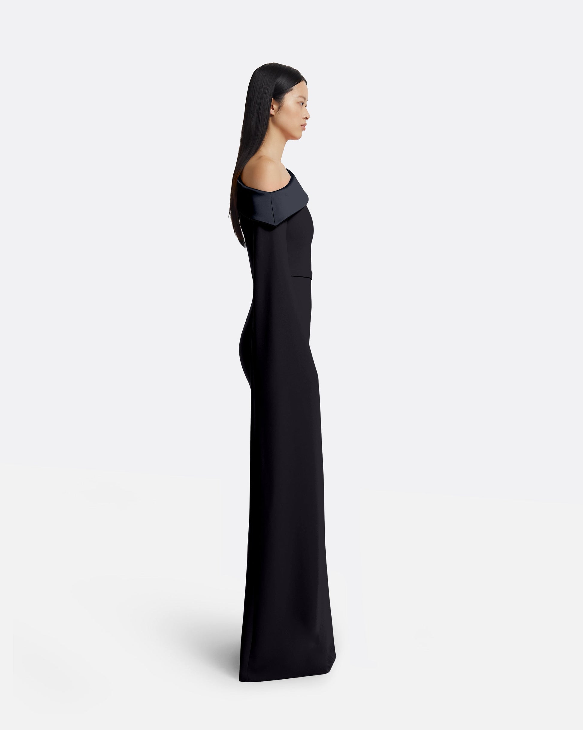 From the Autumn Winter '25 collection, the Rinoa gown in navy on midnight navy balances contrast and curve in a sculptural expression of occasion dressing. The asymmetric neckline and caped sleeves offer sweeping drama against the column base.