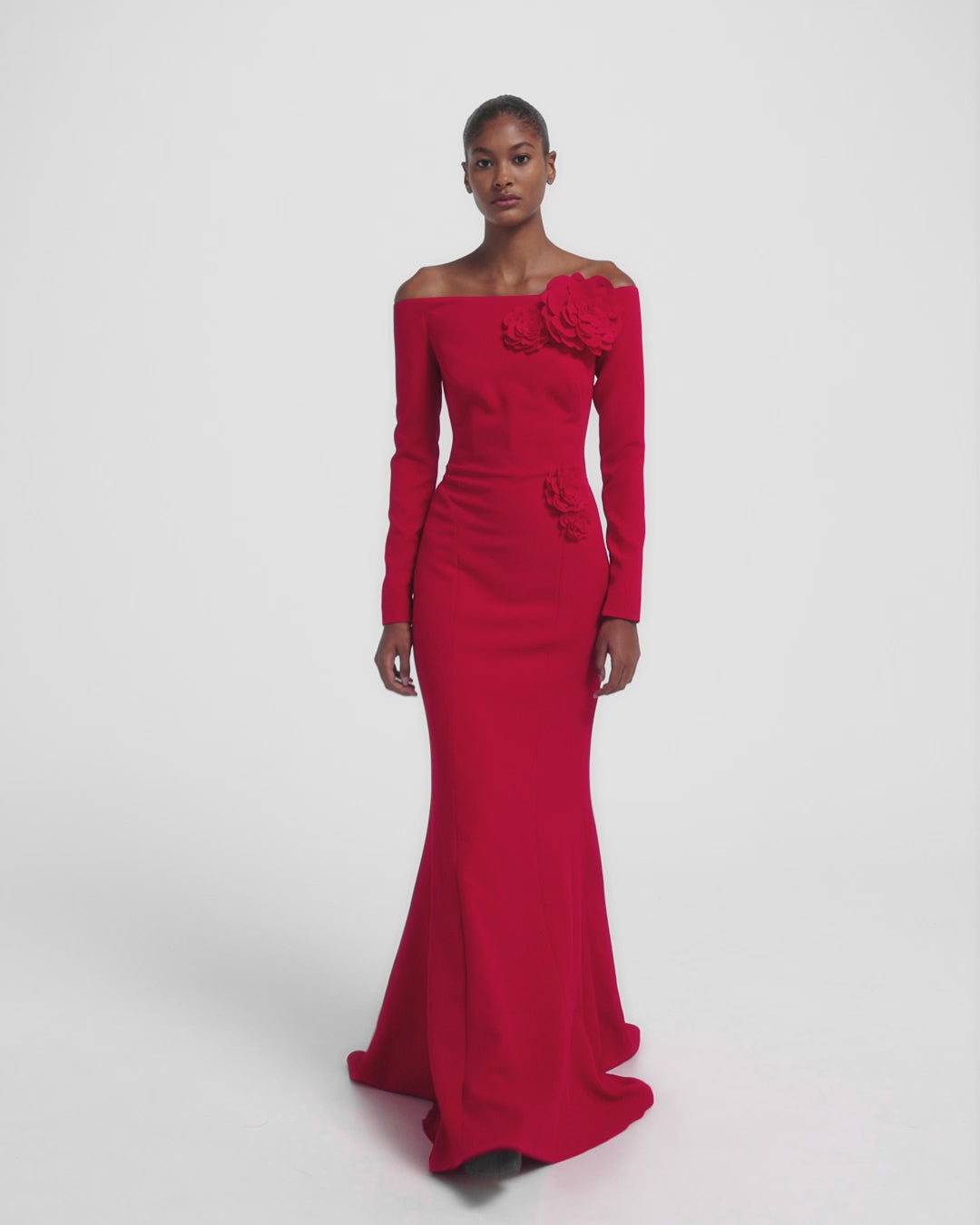 From the Resort ’26 collection, the Rory dress in crimson conveys a sense of sculpted romance. The off-shoulder line frames the décolletage with poise, while refined appliqué introduces depth and dimension to its refined cut.