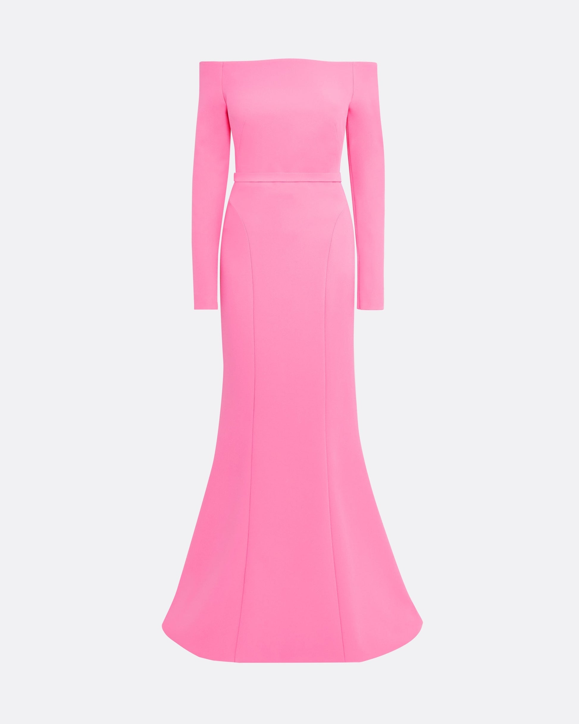 Fishtail gown with off the shoulder, straight neckline and flattering skirt seam lines in aurora Heavy Crepe.