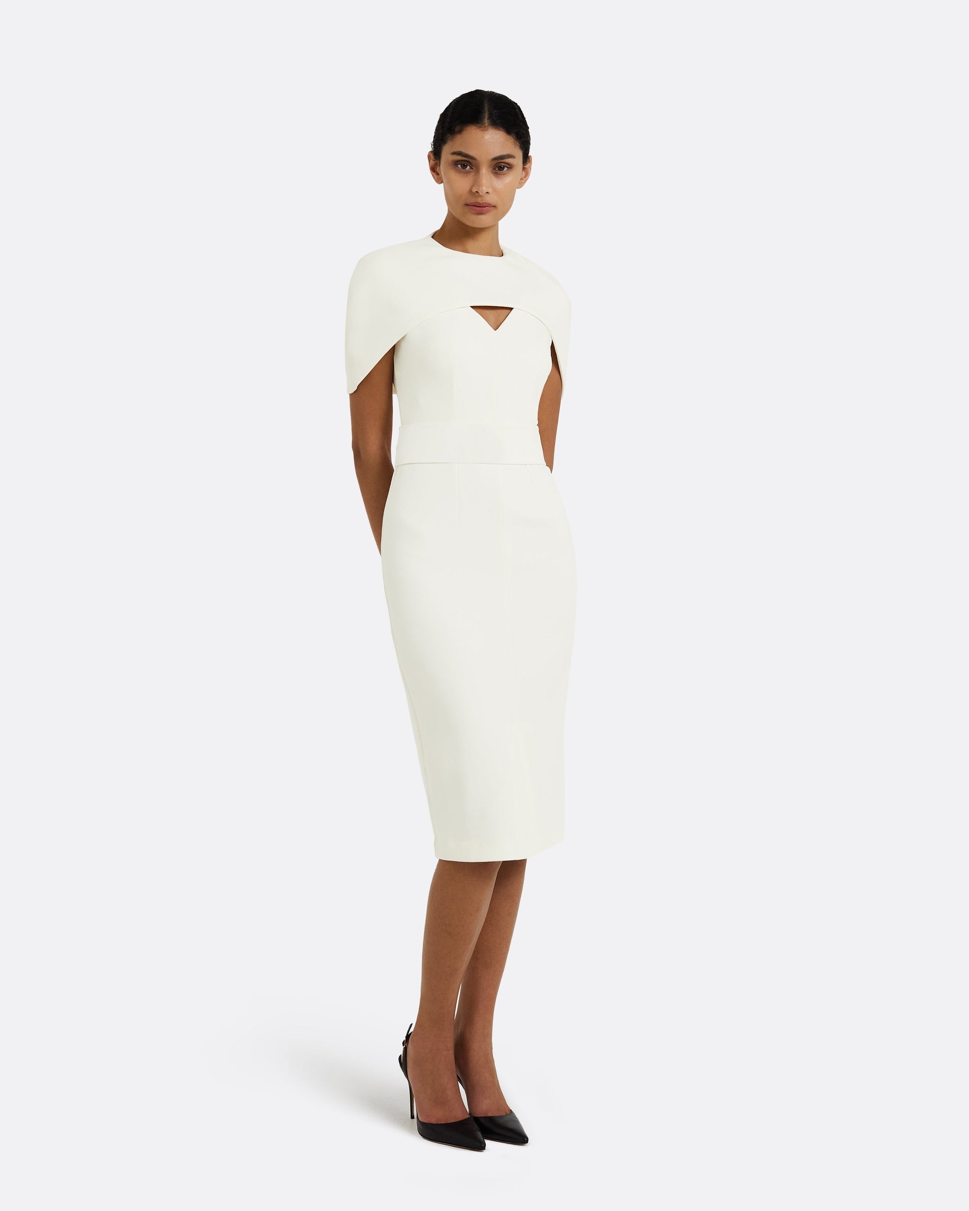 Ivory caped, V-neck, short dress with front slit.