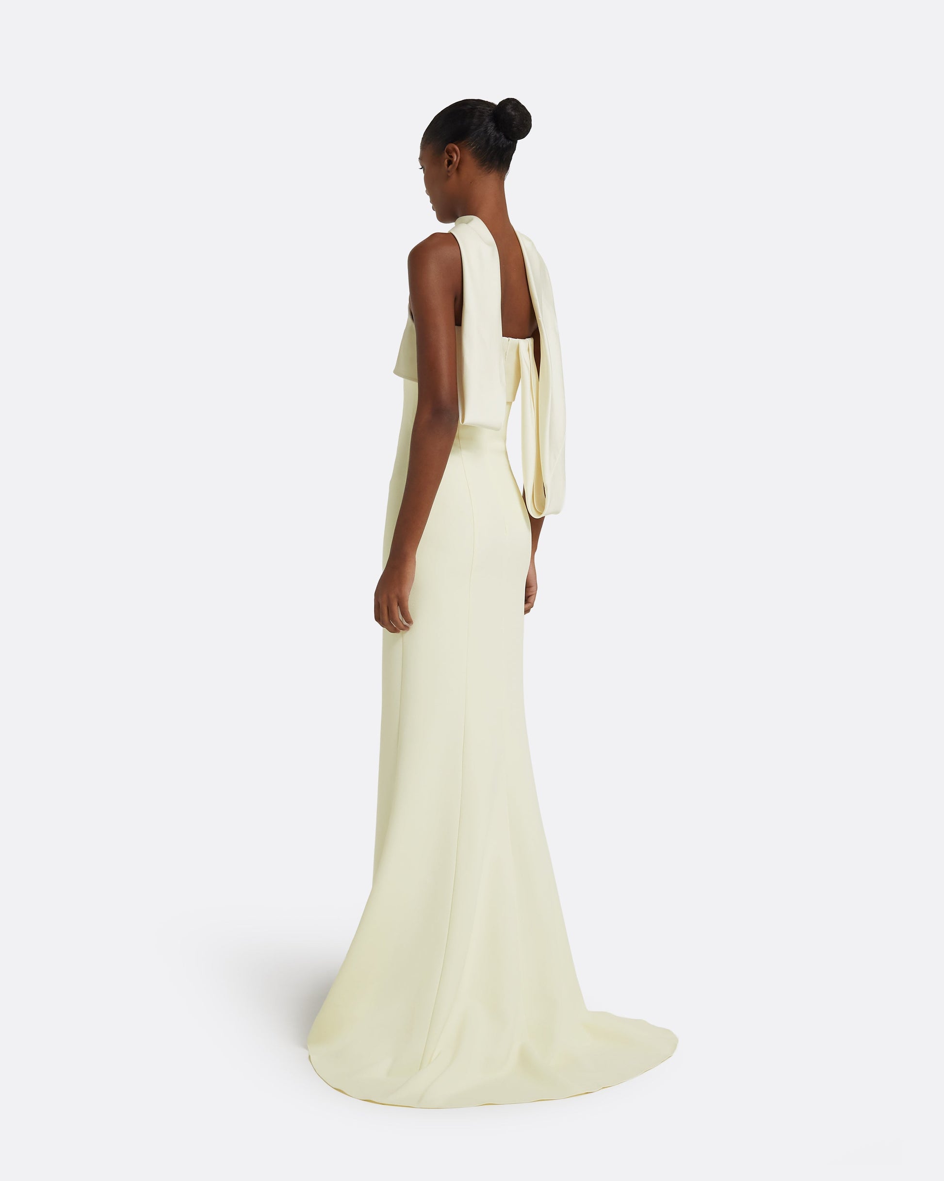 Gown with soft fishtail skirt and scarf detail in sorbet Light Satin Back Crepe on Heavy Crepe.