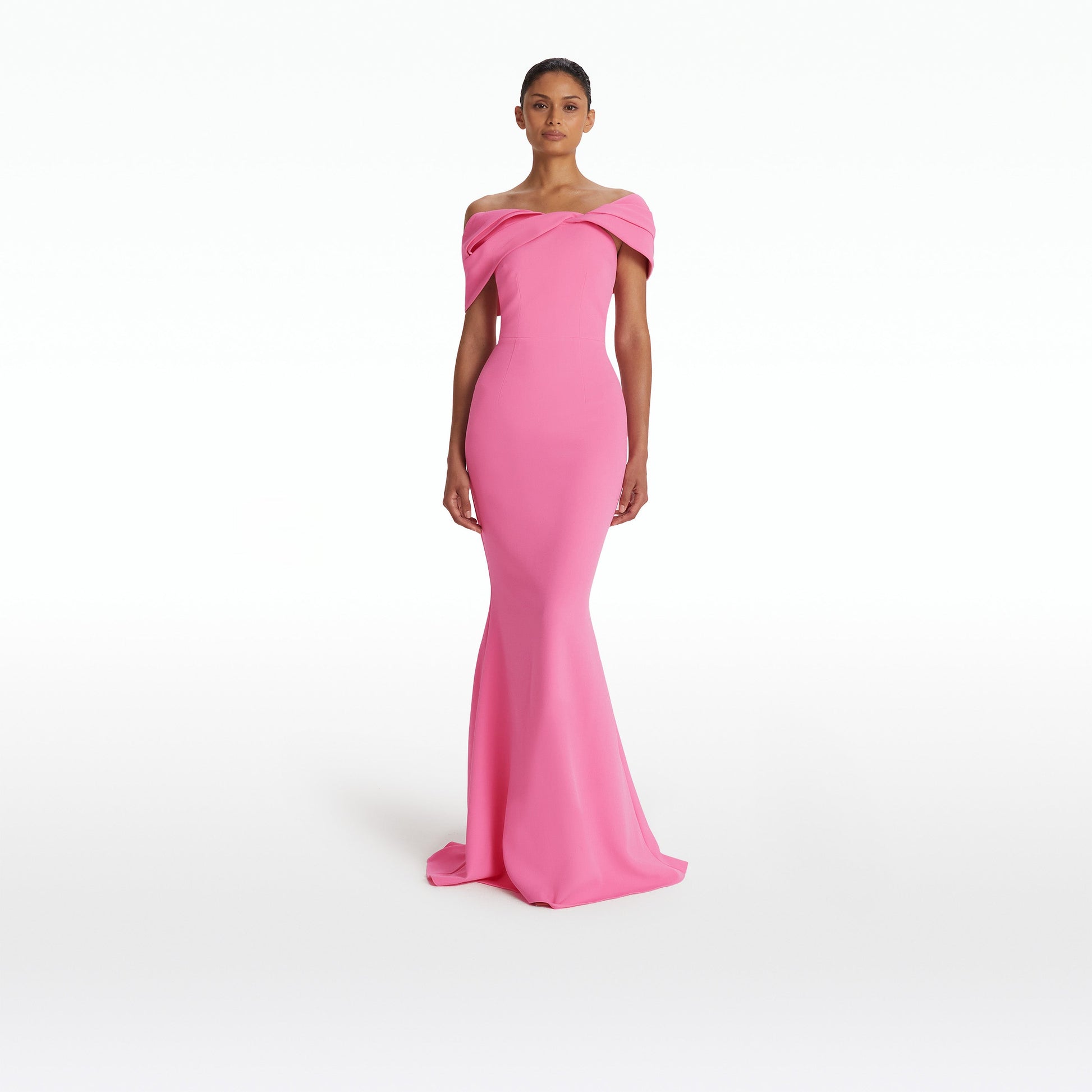 Off-shoulder dress with asymmetric shoulder drape in aurora Heavy Crepe.
