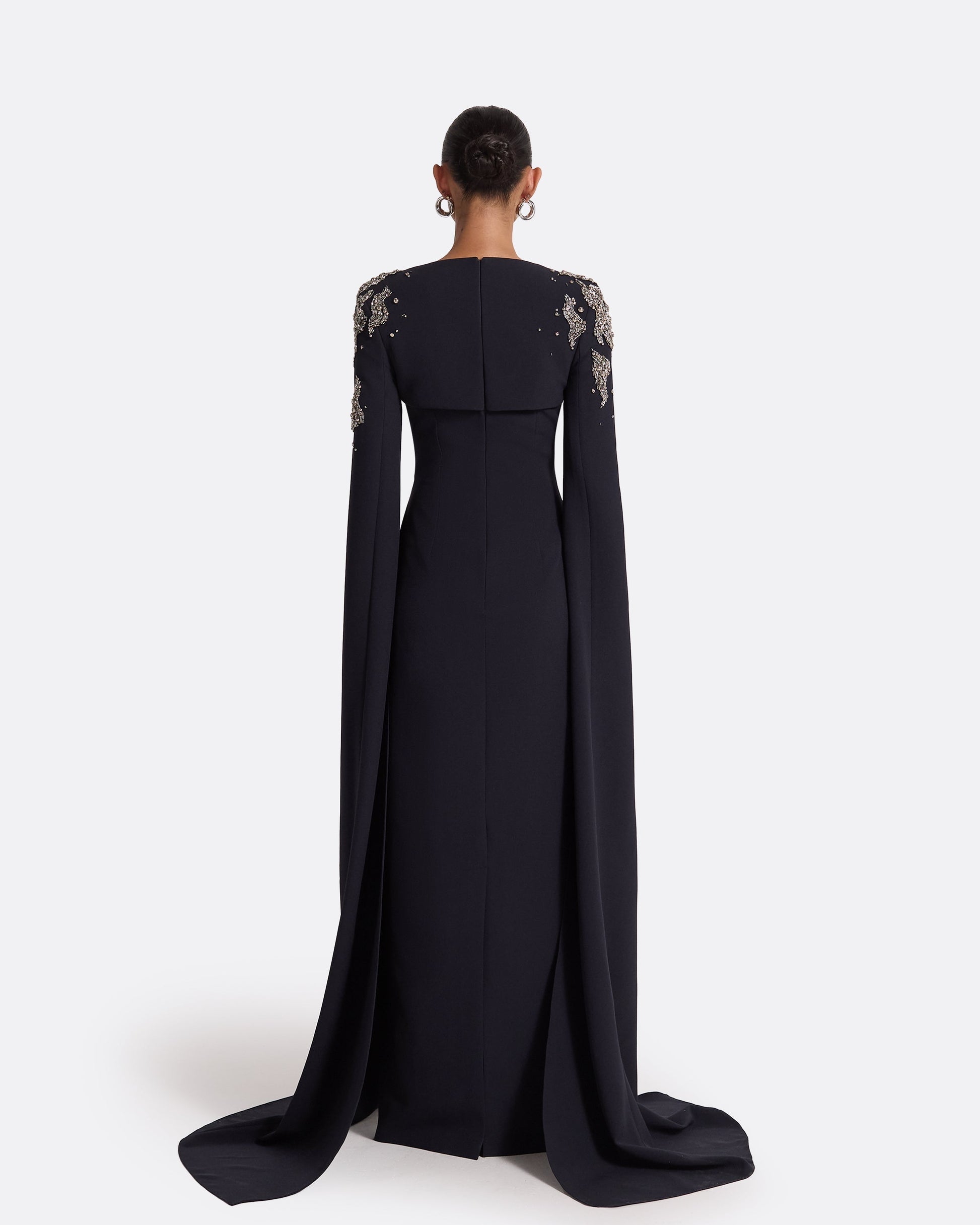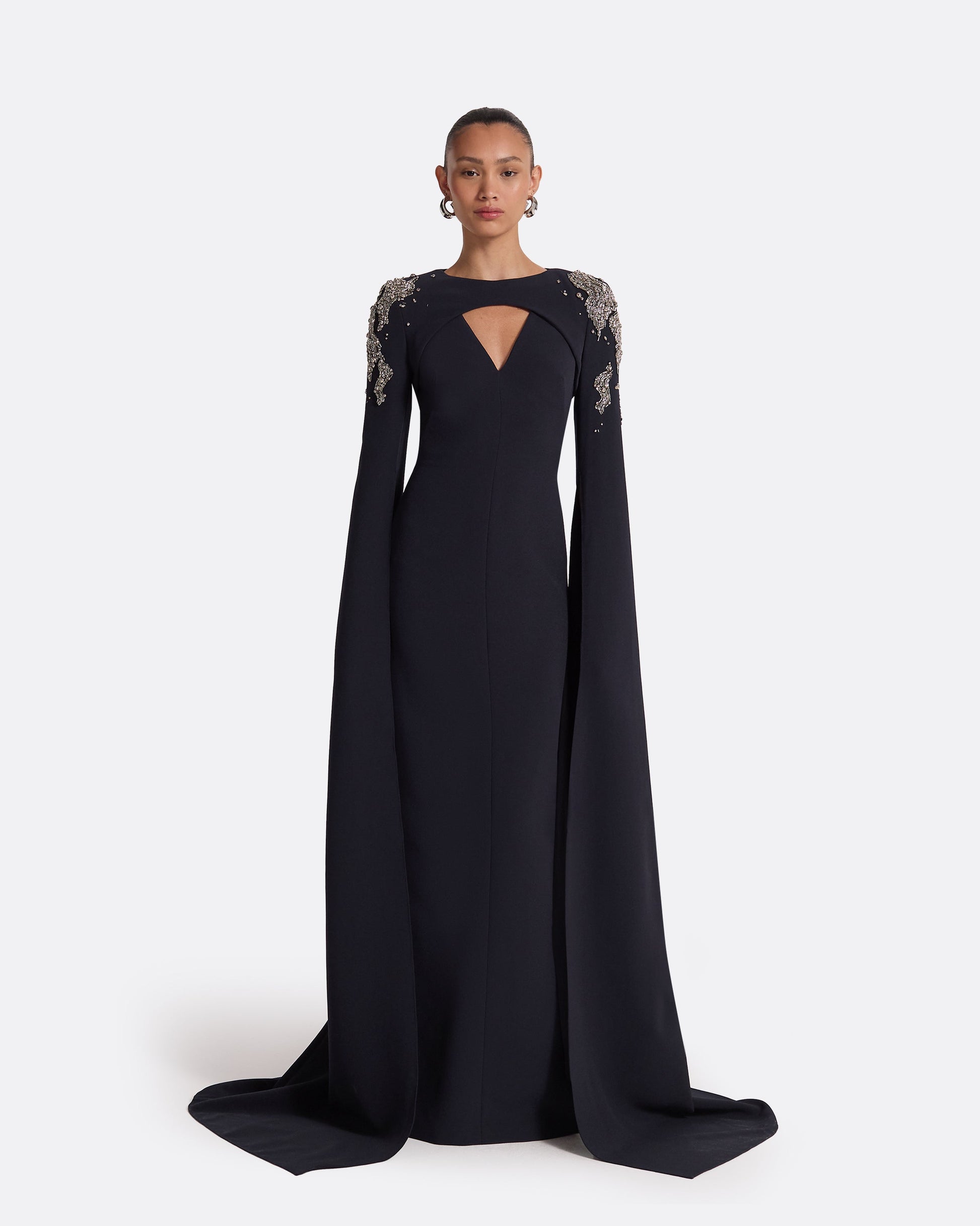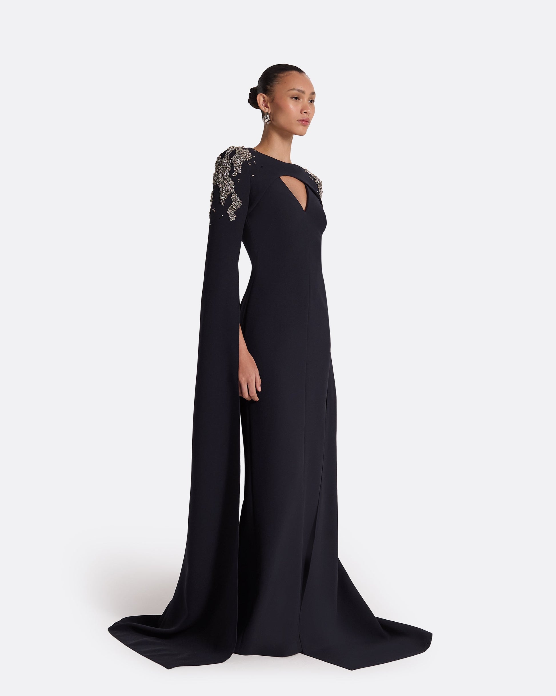 Tailored gown with full sleeve and cut out detail in midnight navy Heavy Crepe with gunmetal Avro embroidery.