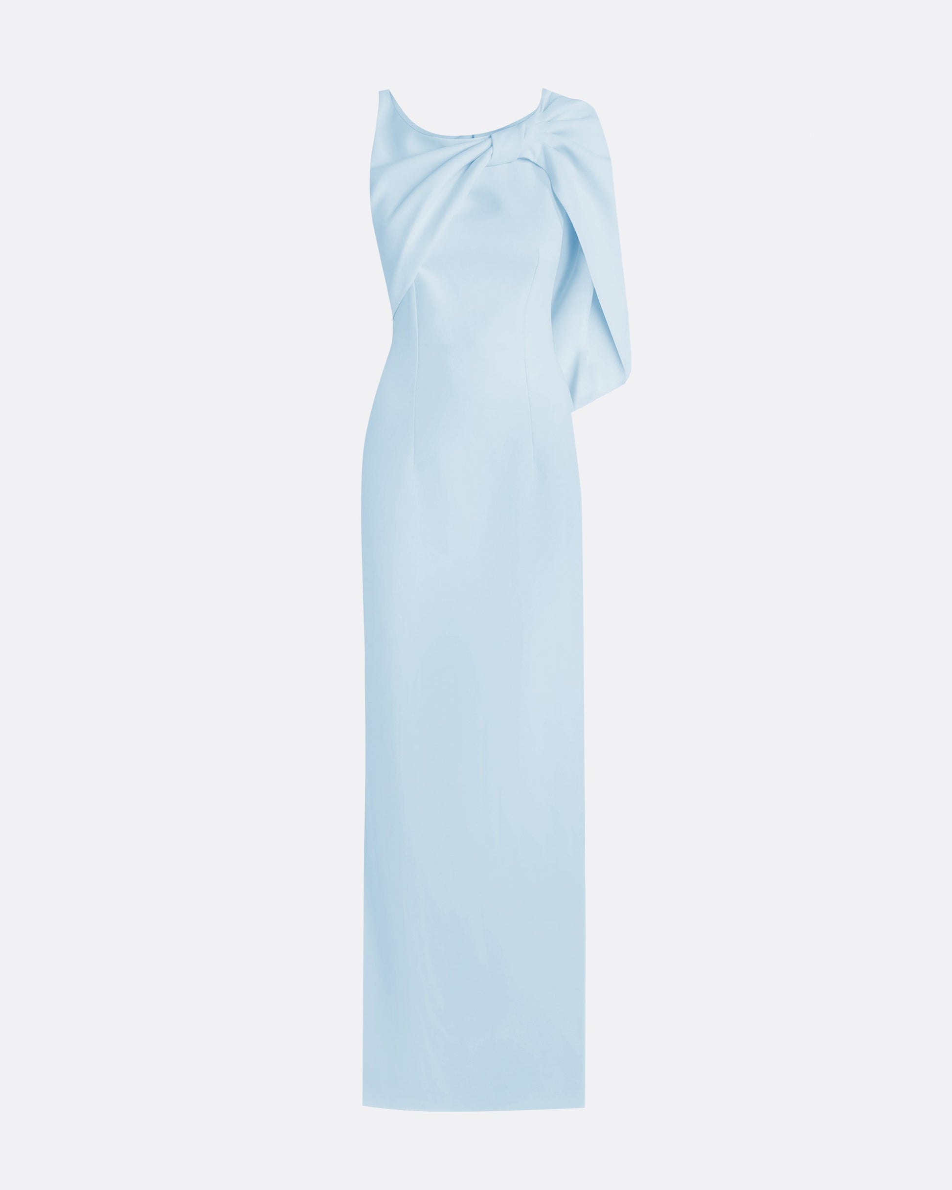 Loop-through bow, semi-caped front, long dress with V-shaped back in pale blue.Item lined.