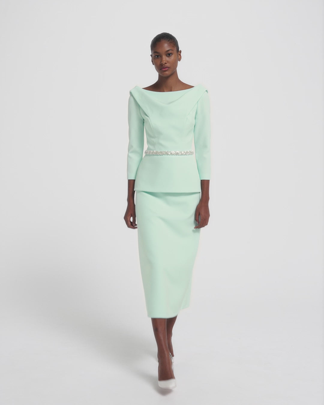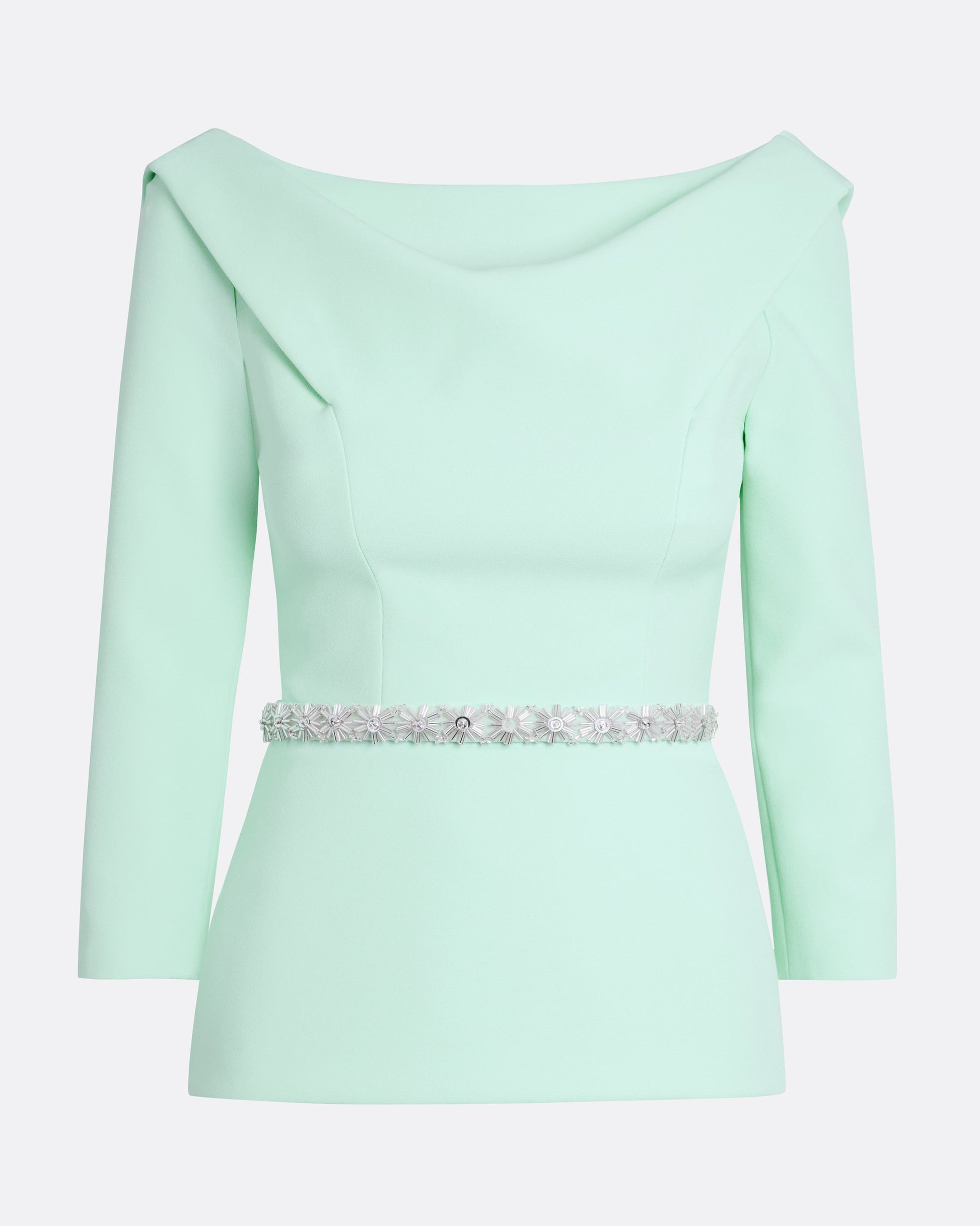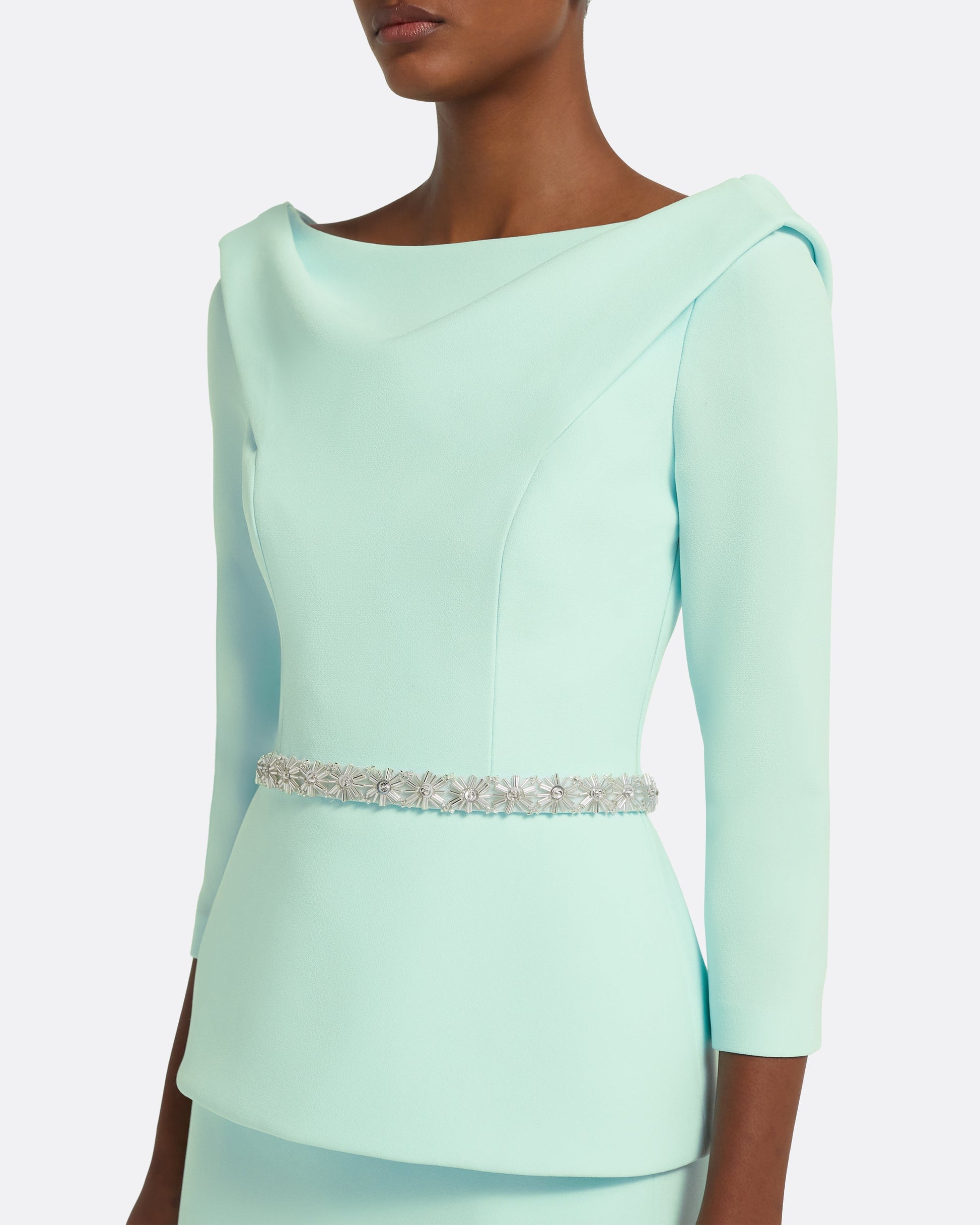From the Resort ’26 collection, the Shawn top balances softness and structure. Its wide boat neckline folds into a sculptural back drape, finished with a crystal belt that highlights the waist with subtle sparkle.