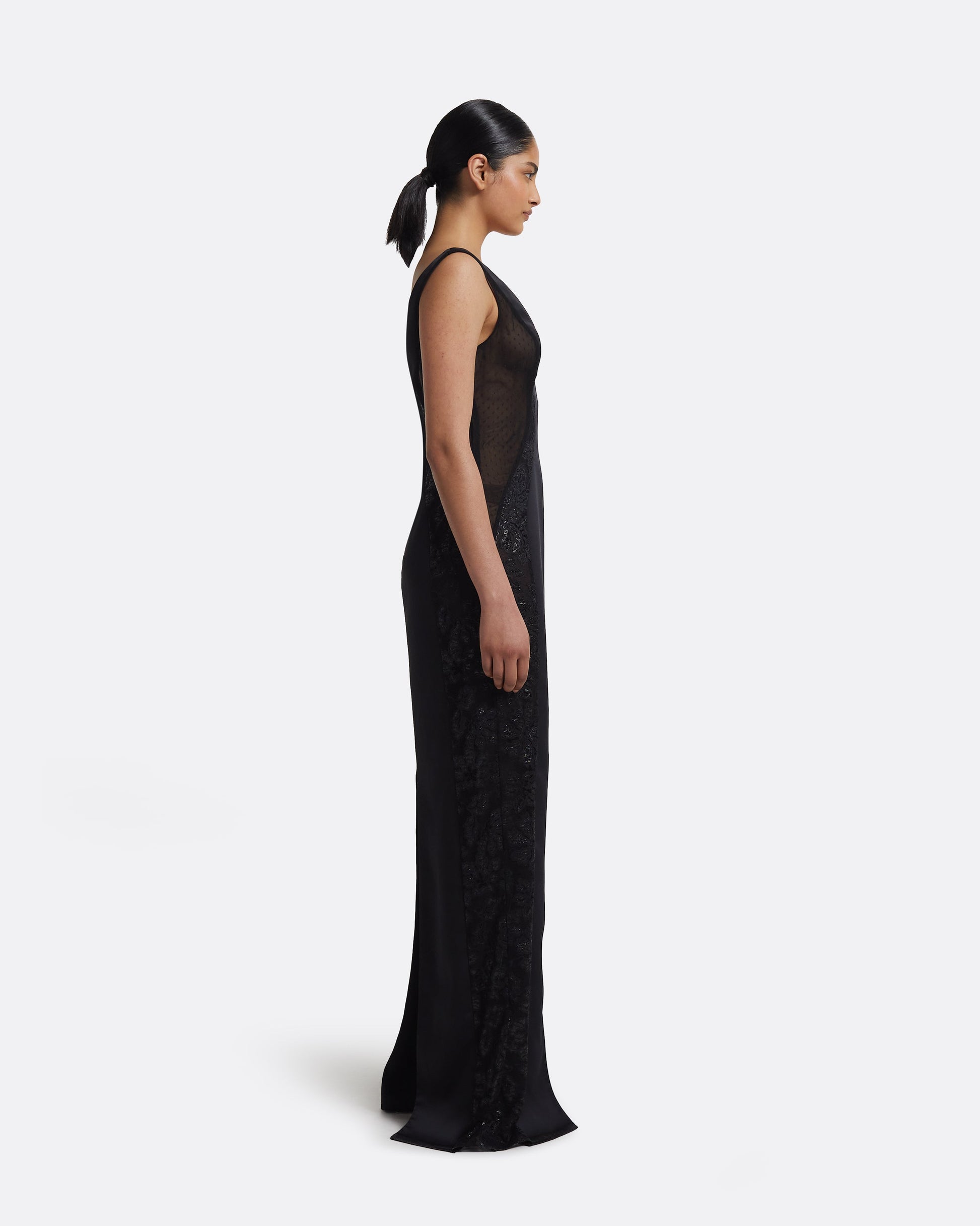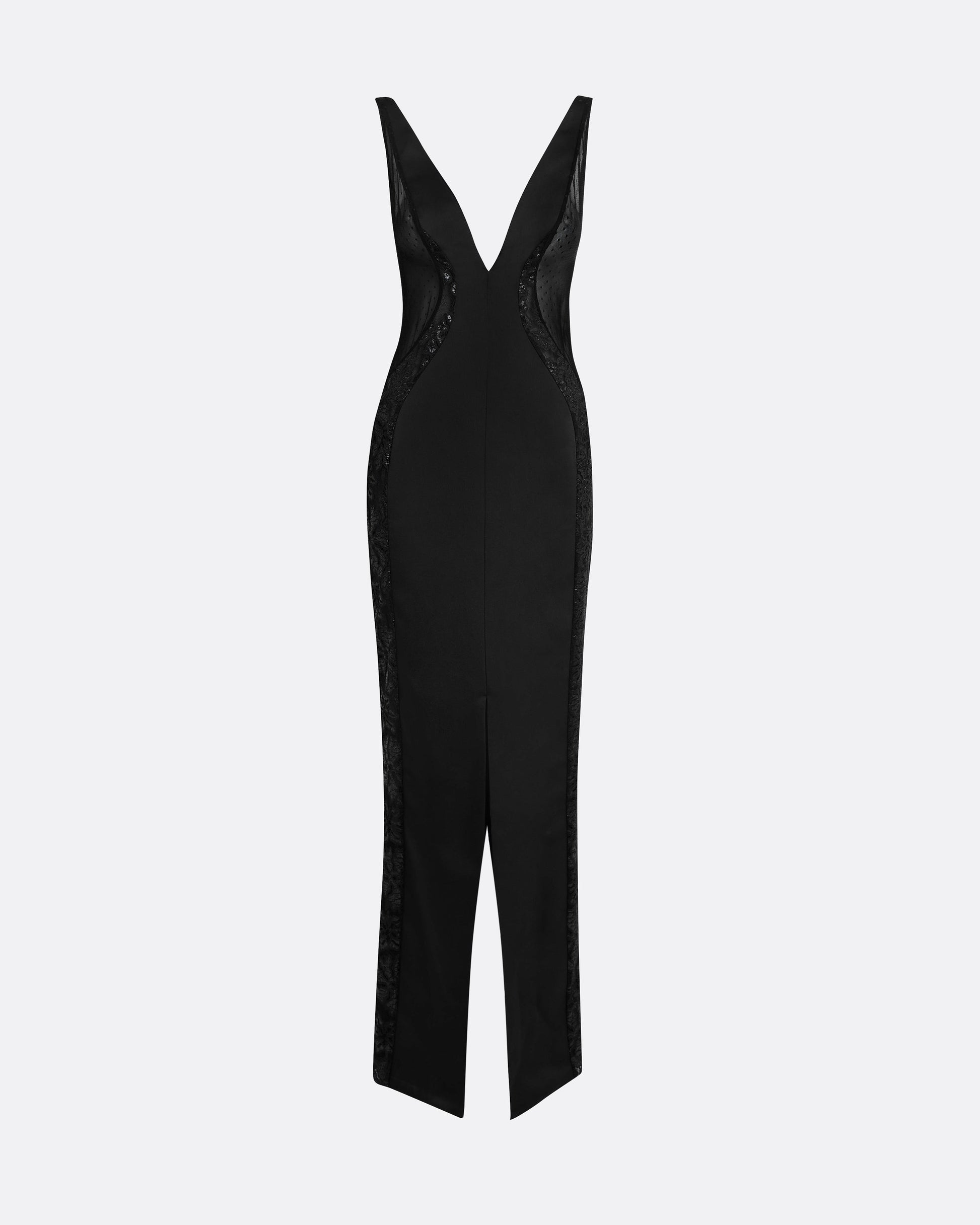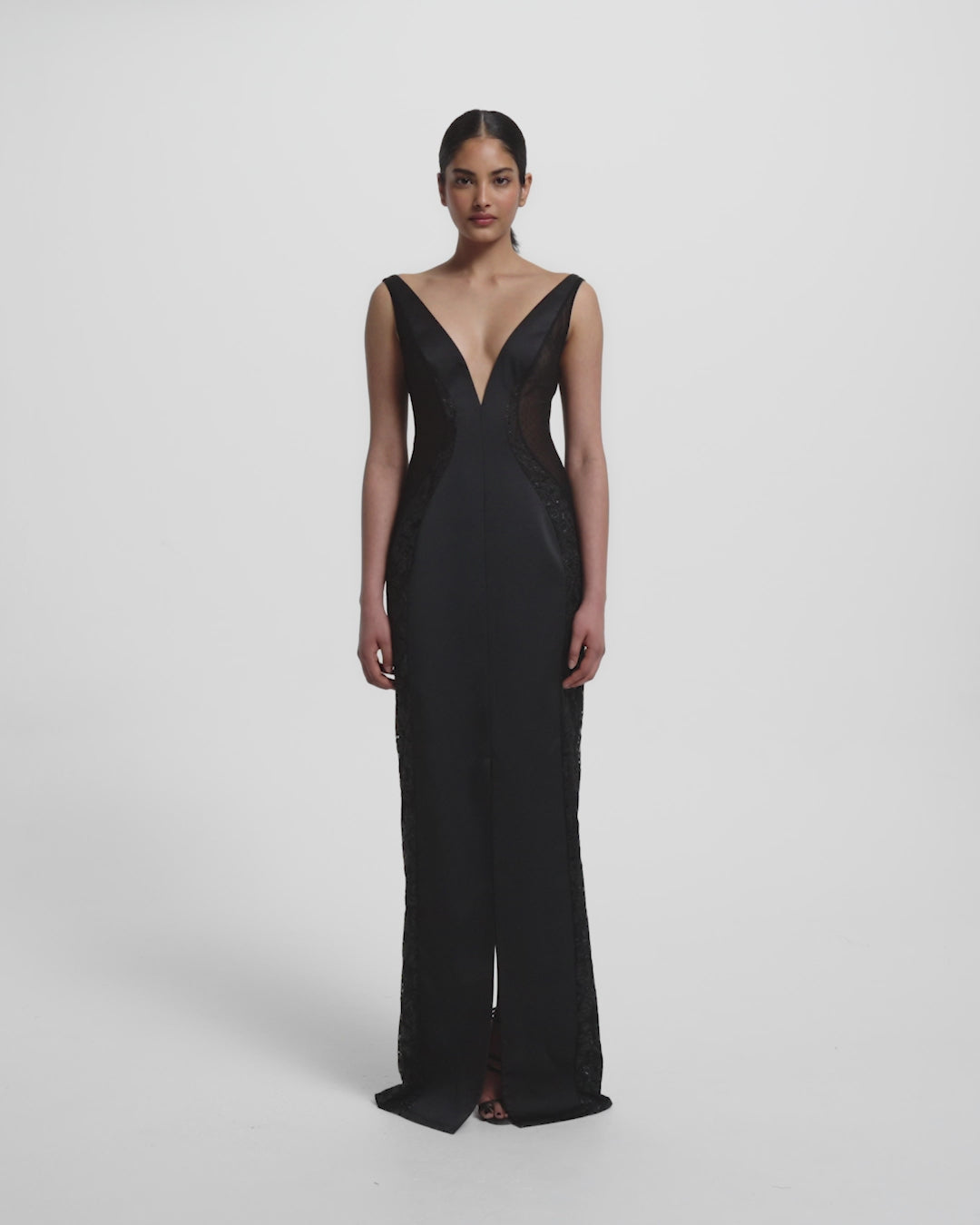 From the Autumn Winter '25 collection, the Shayla gown in black distills bold simplicity into a sculpted line. Defined by a deep neckline and clean, sleeveless cut, it balances allure with a focused, architectural presence.