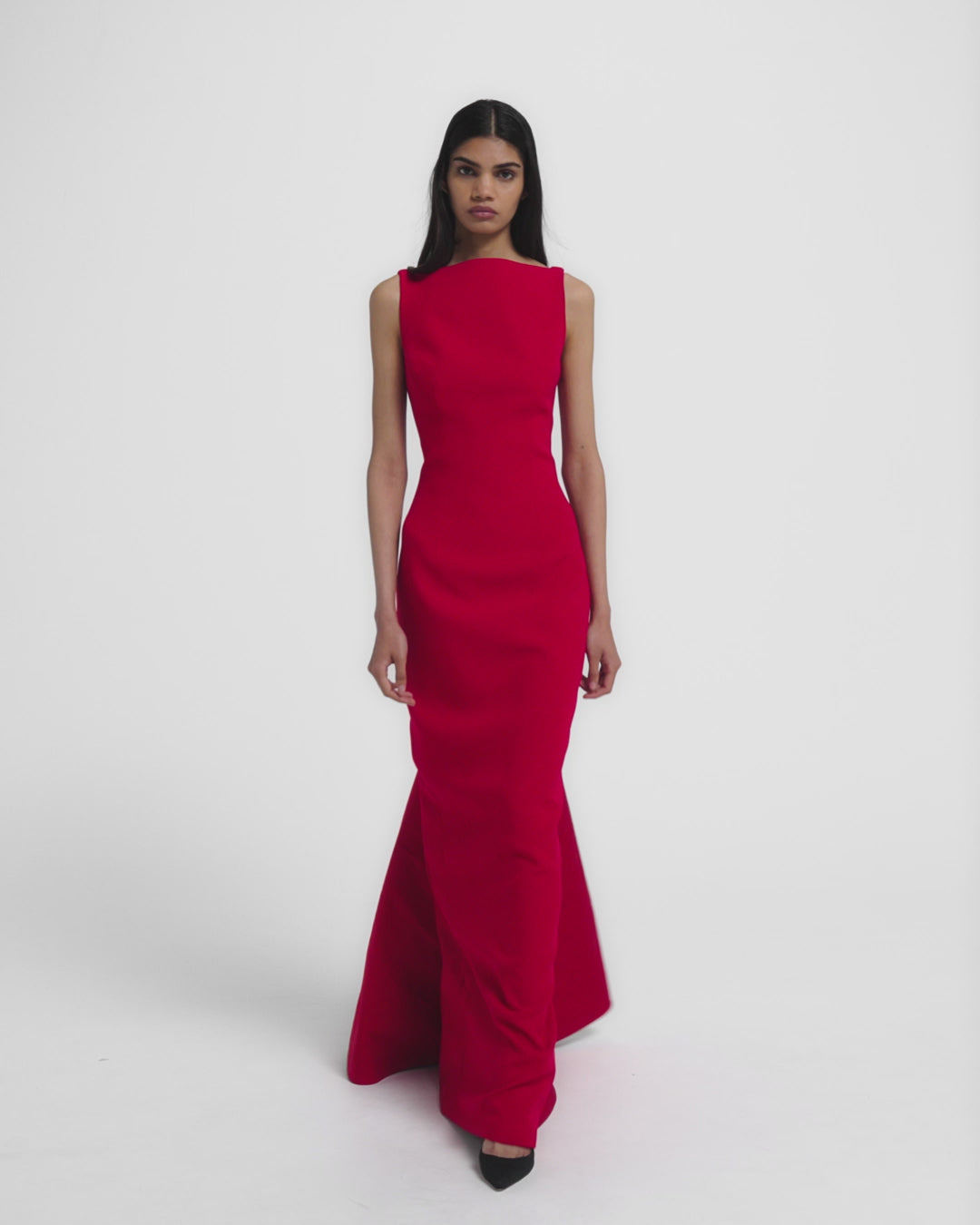 From the Resort ’26 collection, the Sloane gown balances composure with drama. Its clean, columnar lines open into a vivid flare, creating a play of contrast that commands attention.