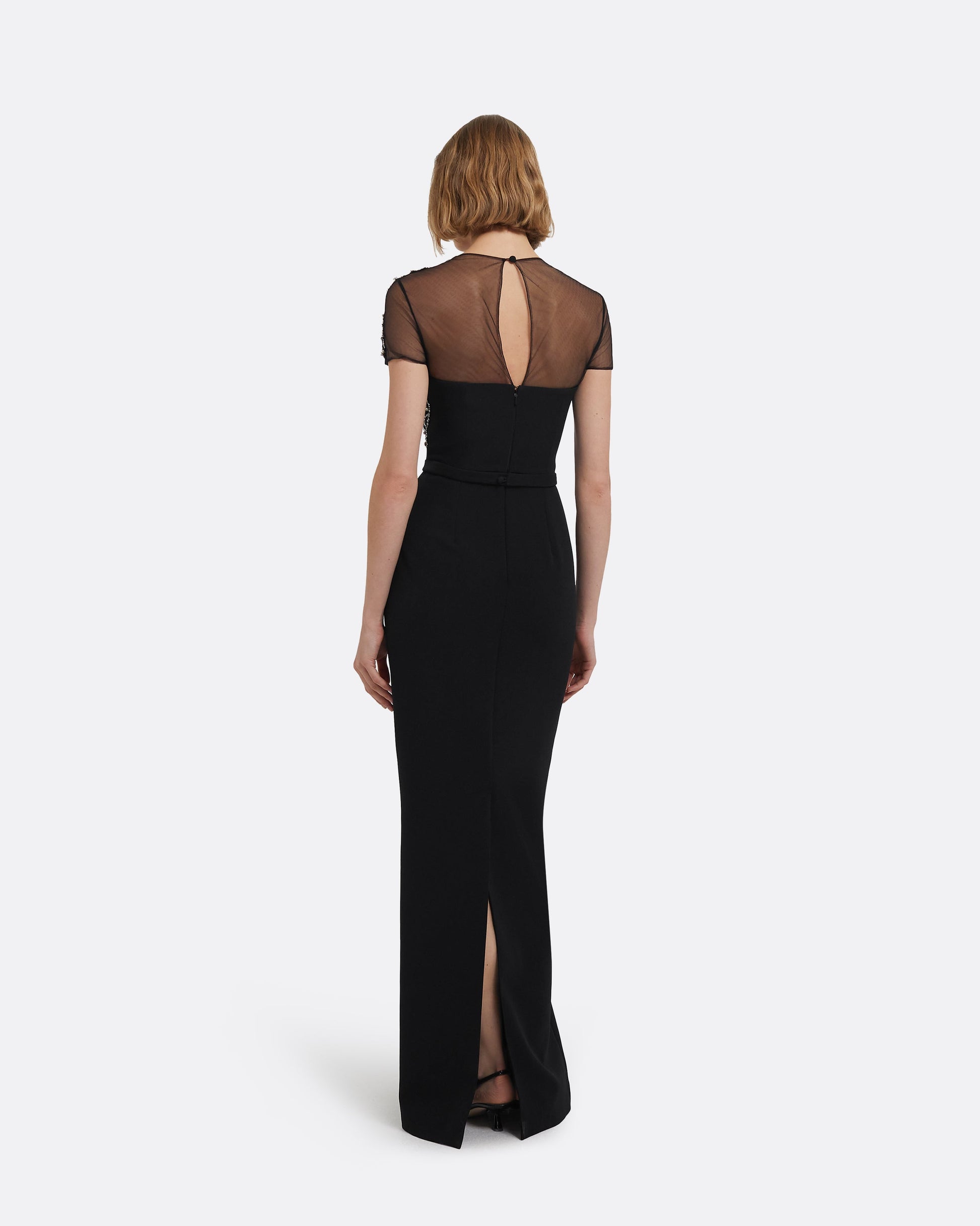Short sleeve illusion gown with round neckline in black with crystal.