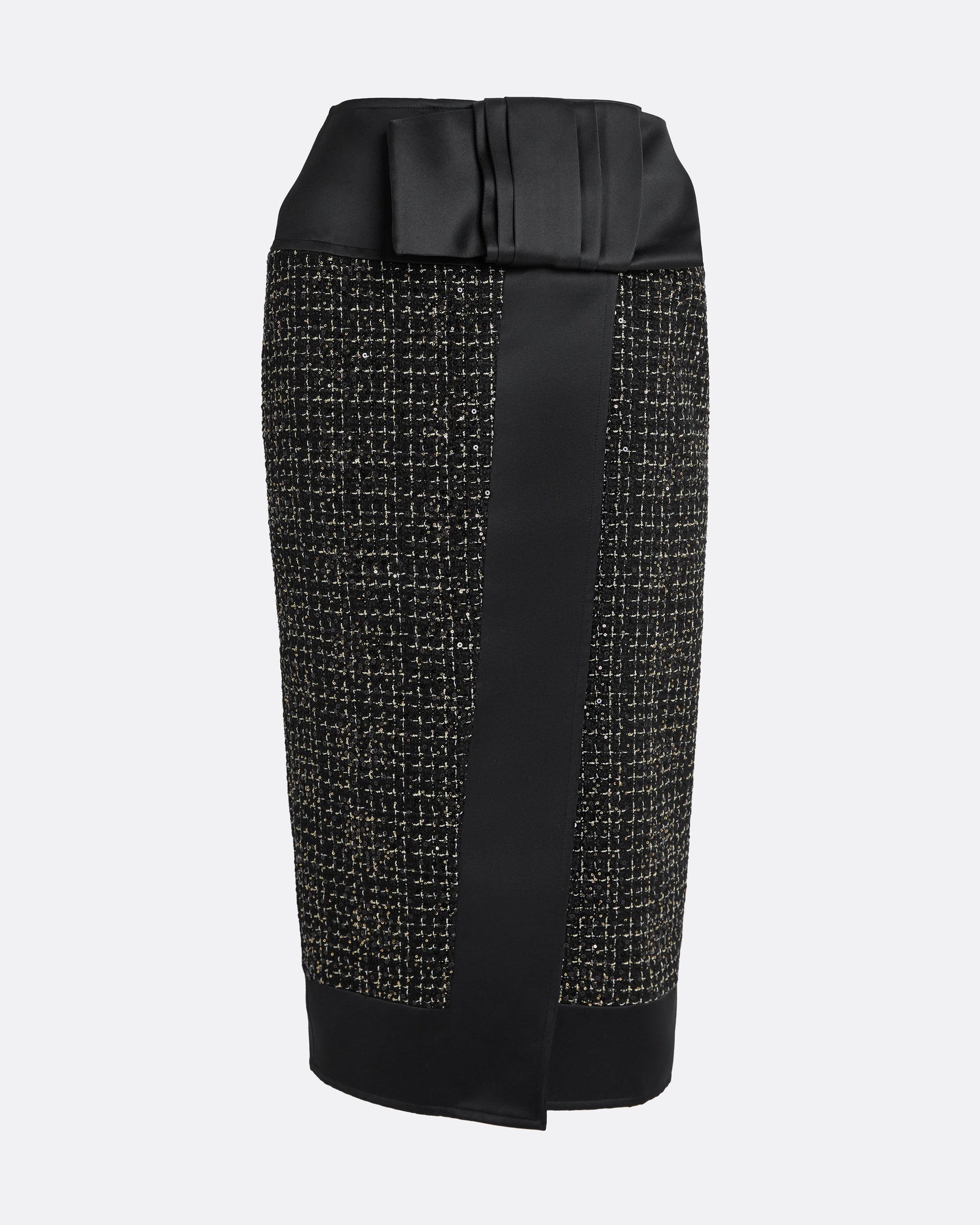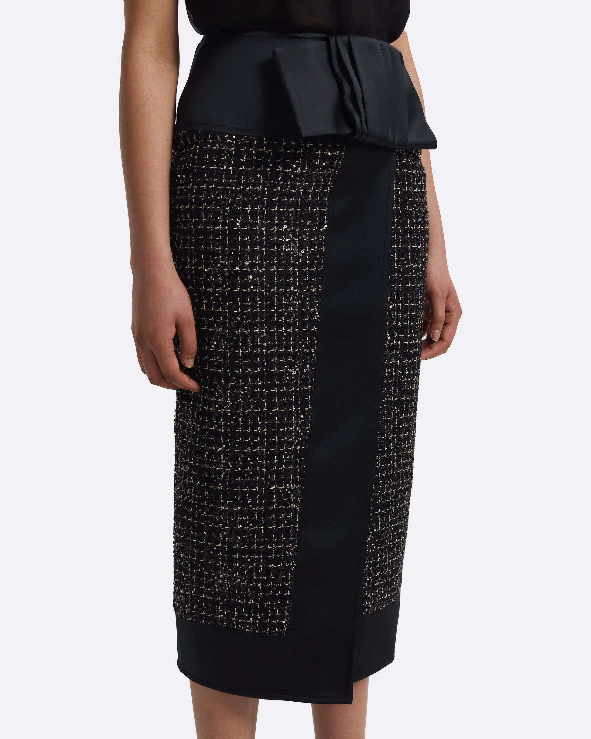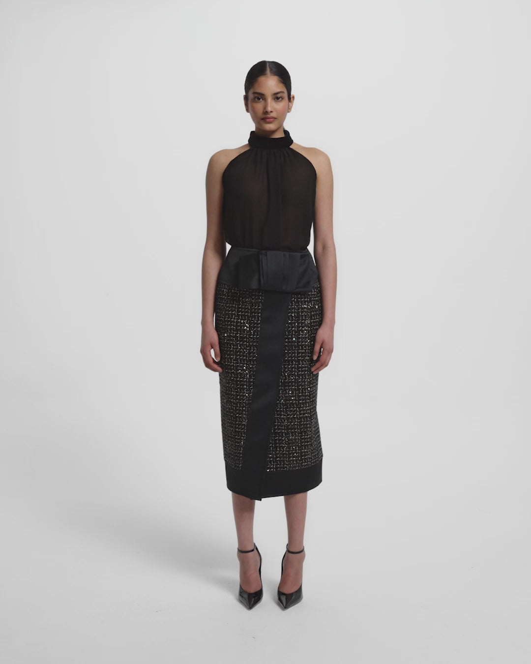 From the Autumn Winter '25 collection, the Suki skirt in black with gold introduces a dynamic energy through sculpted detail. A central knot gathers the fabric into an asymmetric front slit, bringing shape and direction to its clean midi cut.