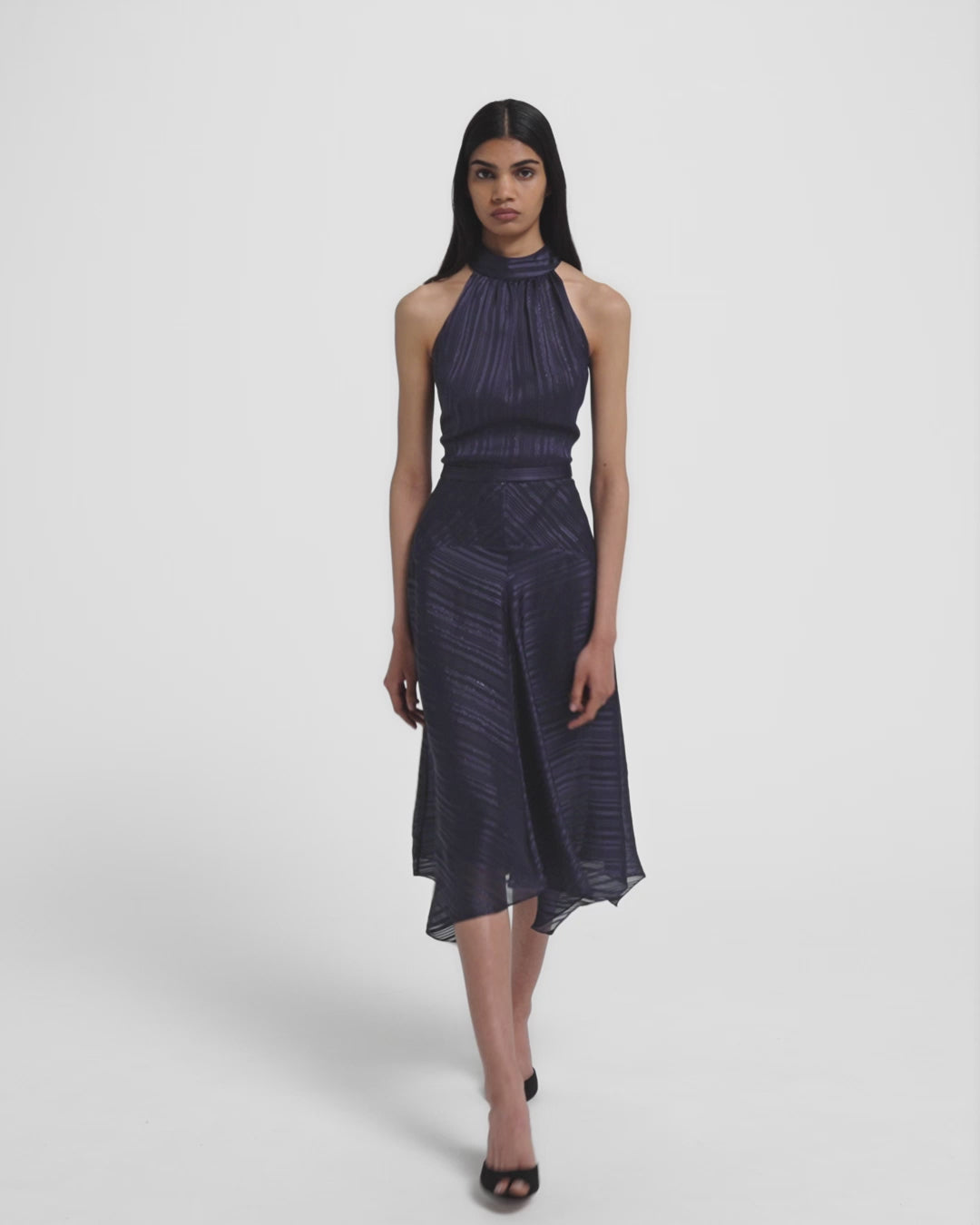 From the Resort ’26 collection, the Sunny midi dress in navy brings sculpted movement to occasion dressing. The halterneck cut accentuates the shoulders, while the flared hem creates soft volume with every step.
