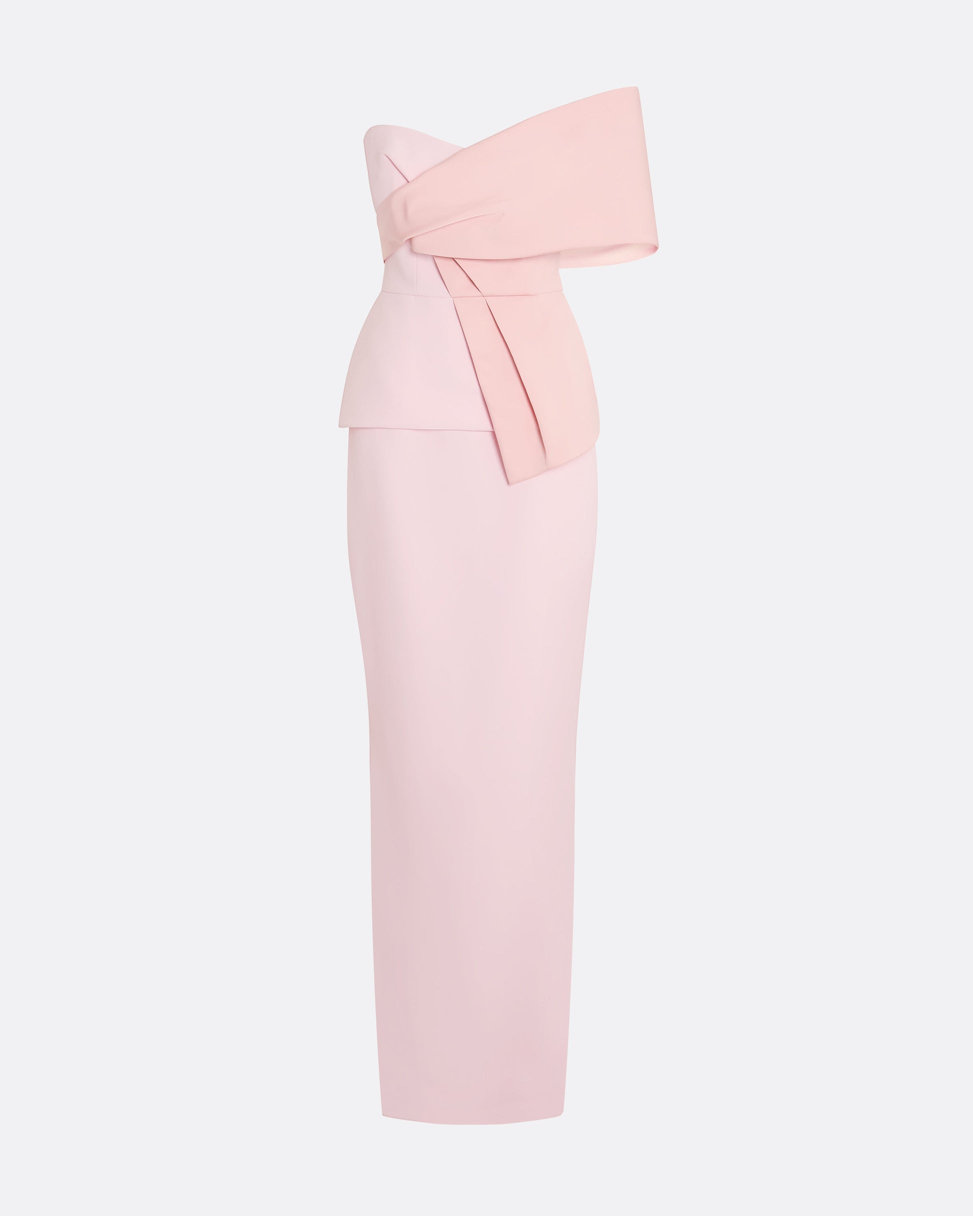 Column gown with off shoulder draped detail and simple peplum in peony blush Heavy Crepe and Faille.