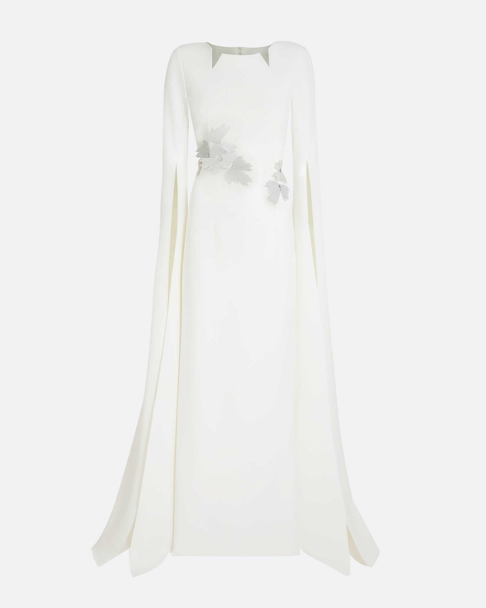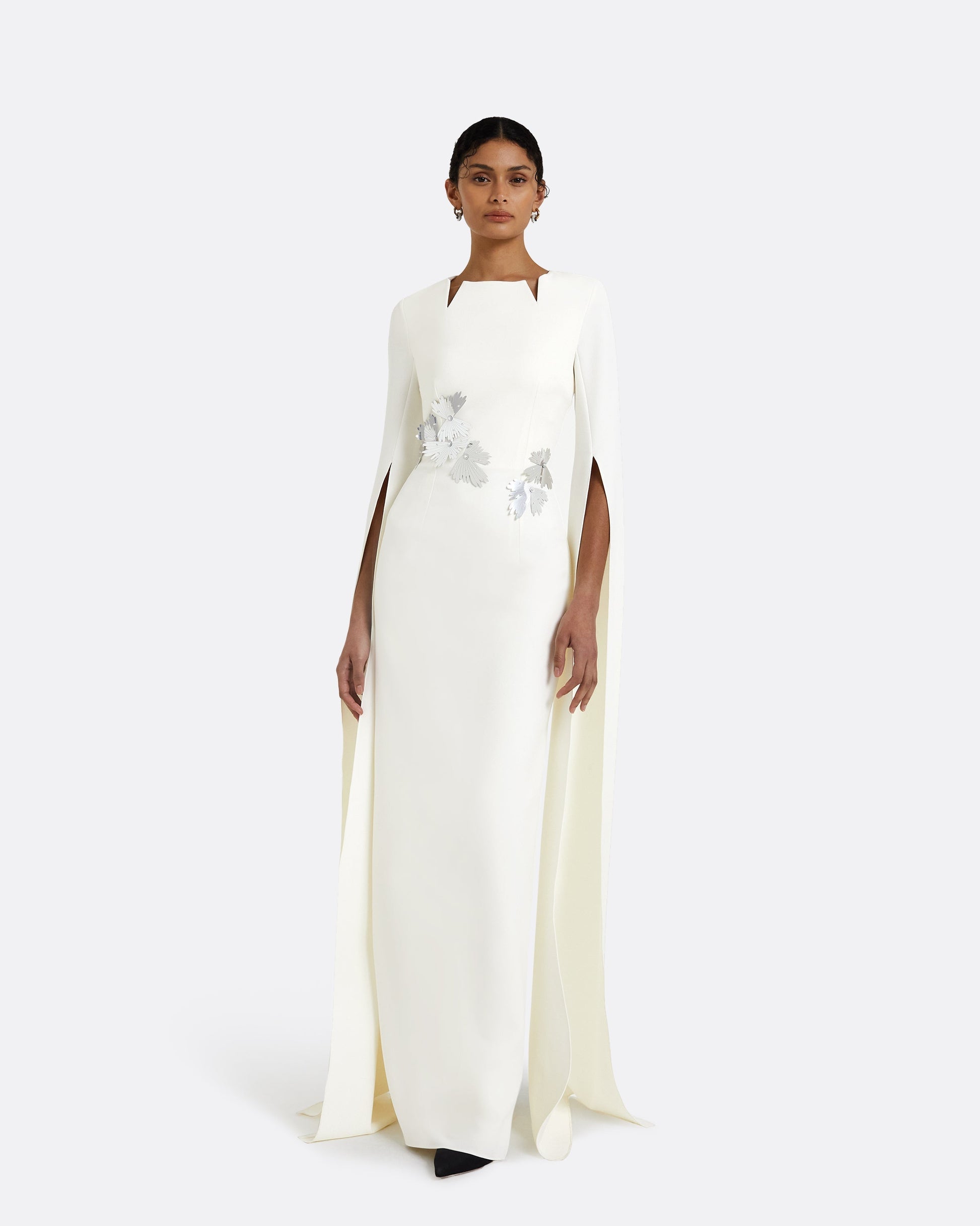 Full-length embroidered dress with a slashed round neckline and full-length caped sleeves, in Ivory.