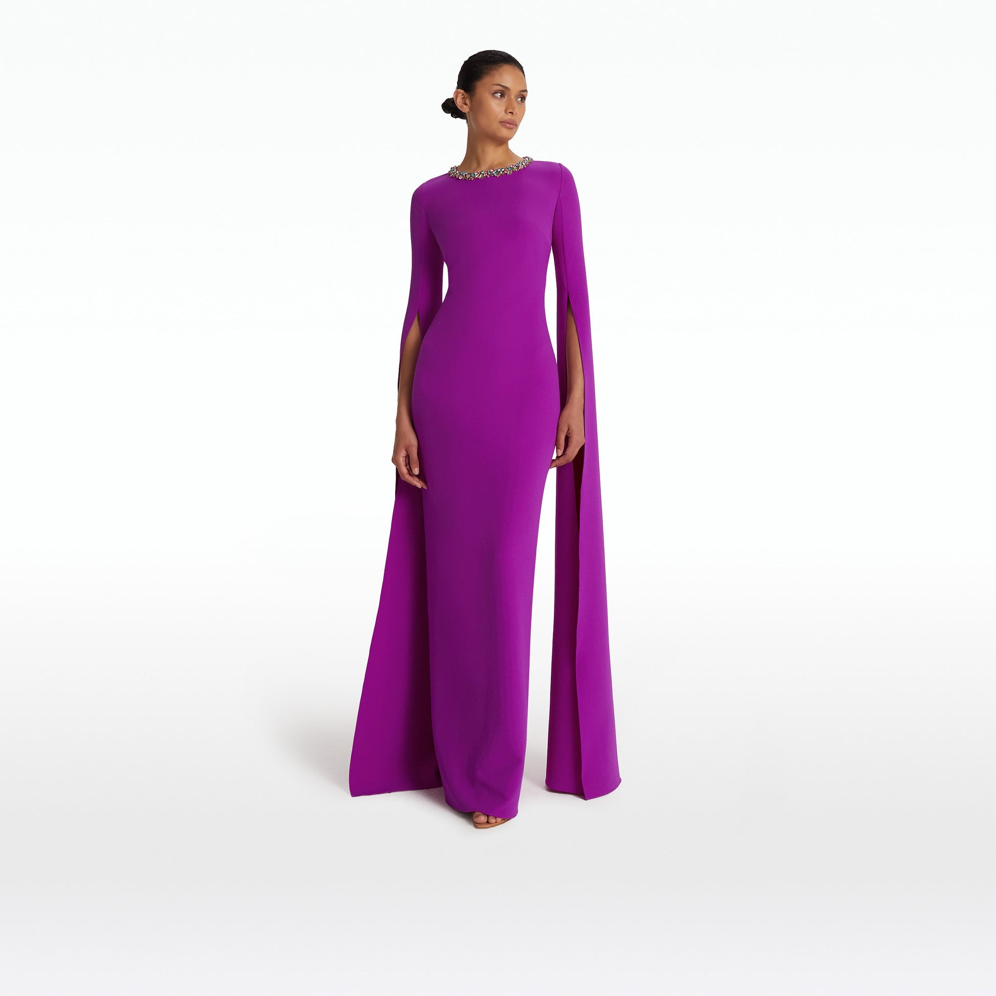 Gown with boat neck and split sleeve in magenta Heavy Crepe with multi-brights Crystal Trim B embroidery.