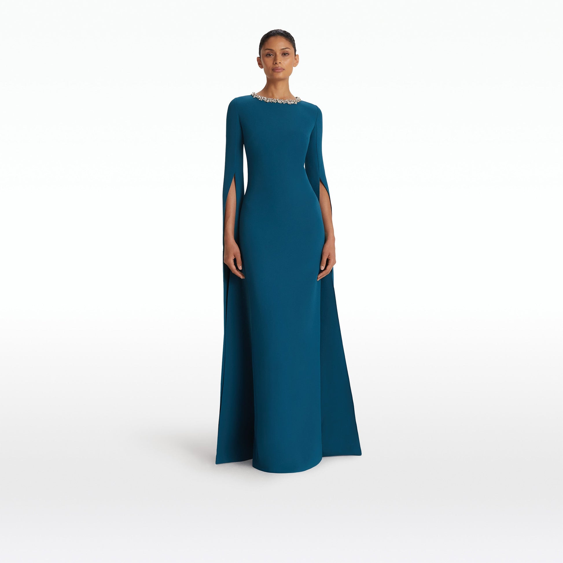 Gown with boat neck and split sleeve in poseidon Heavy Crepe with smoke/crystal Crystal Trim B embroidery.