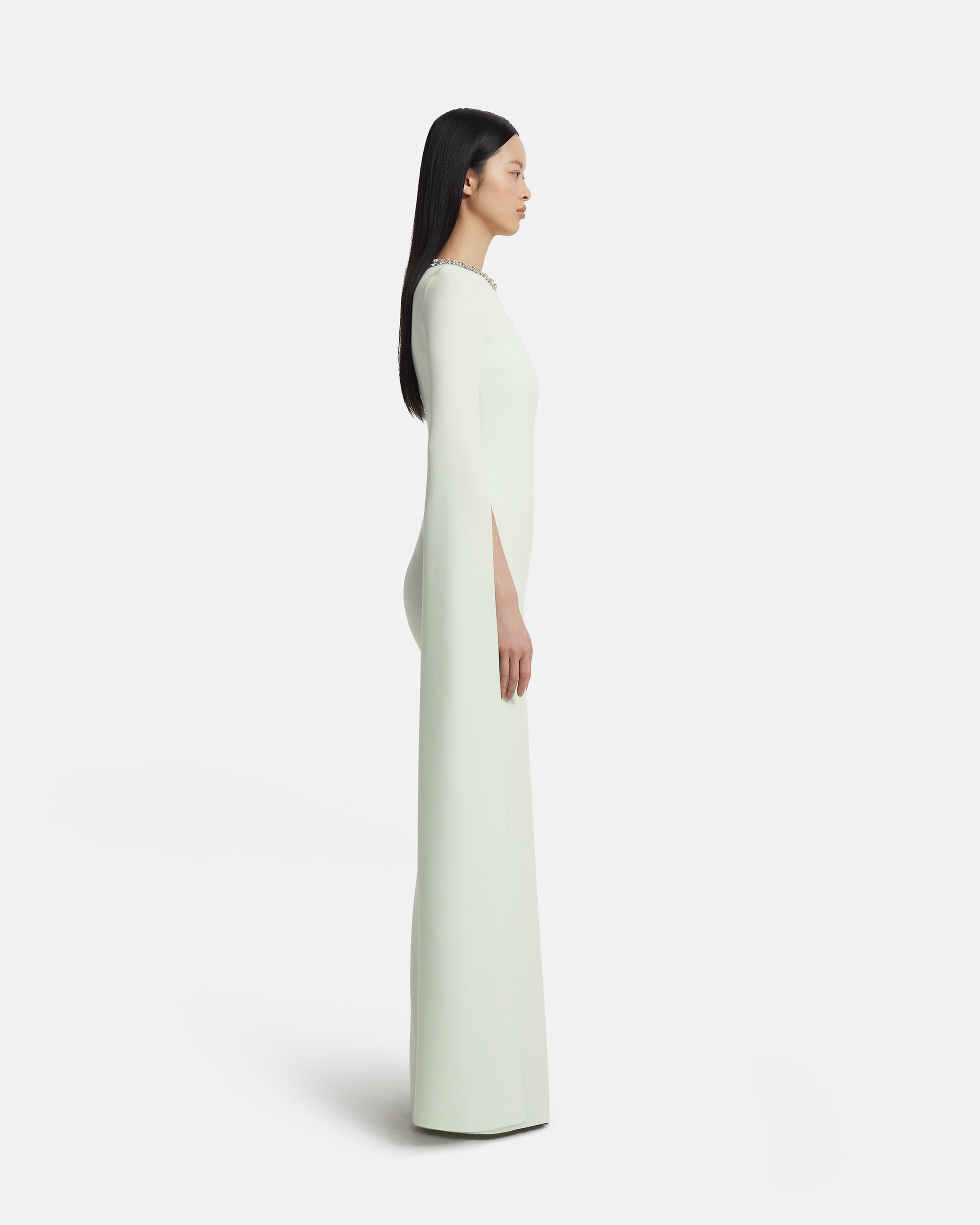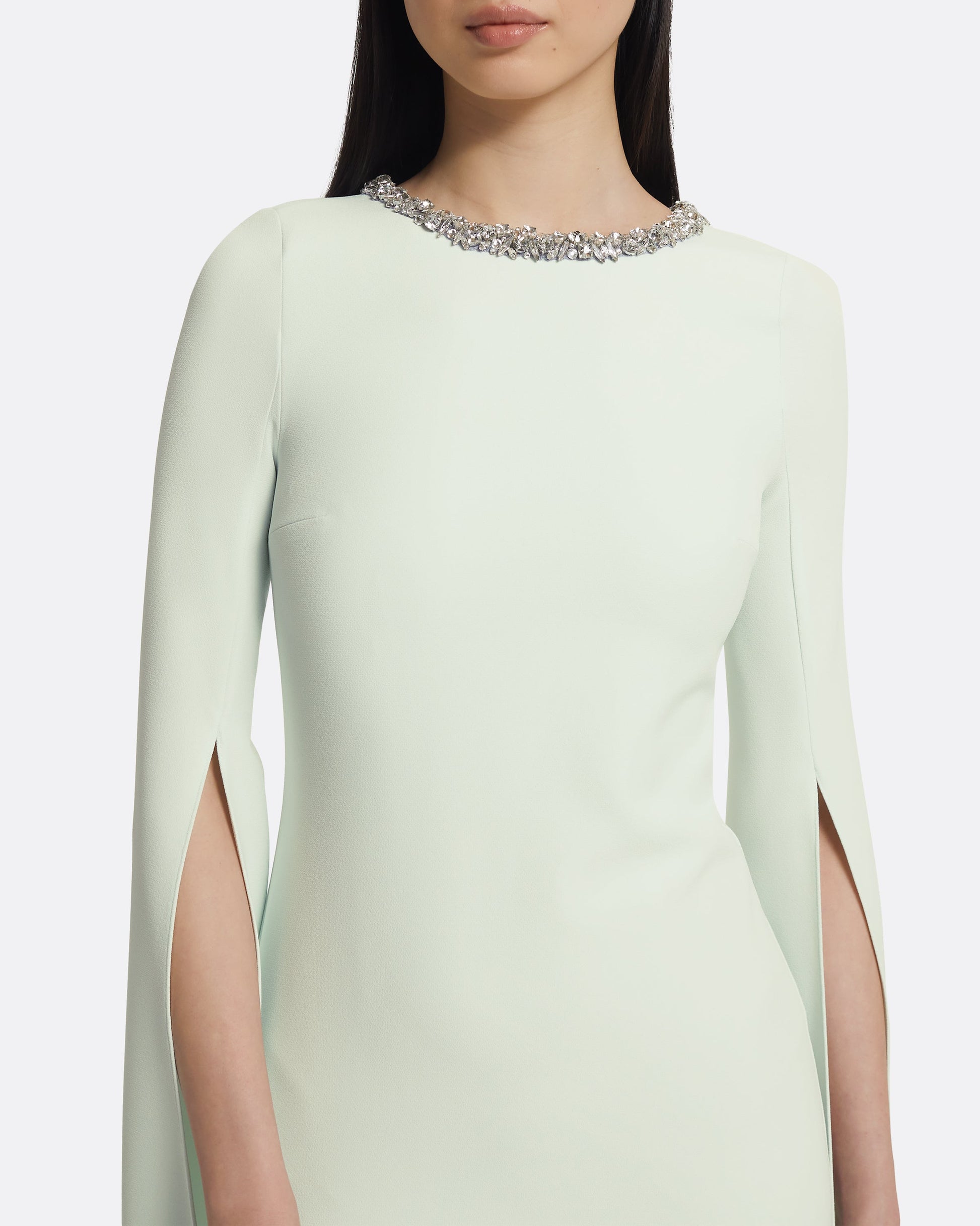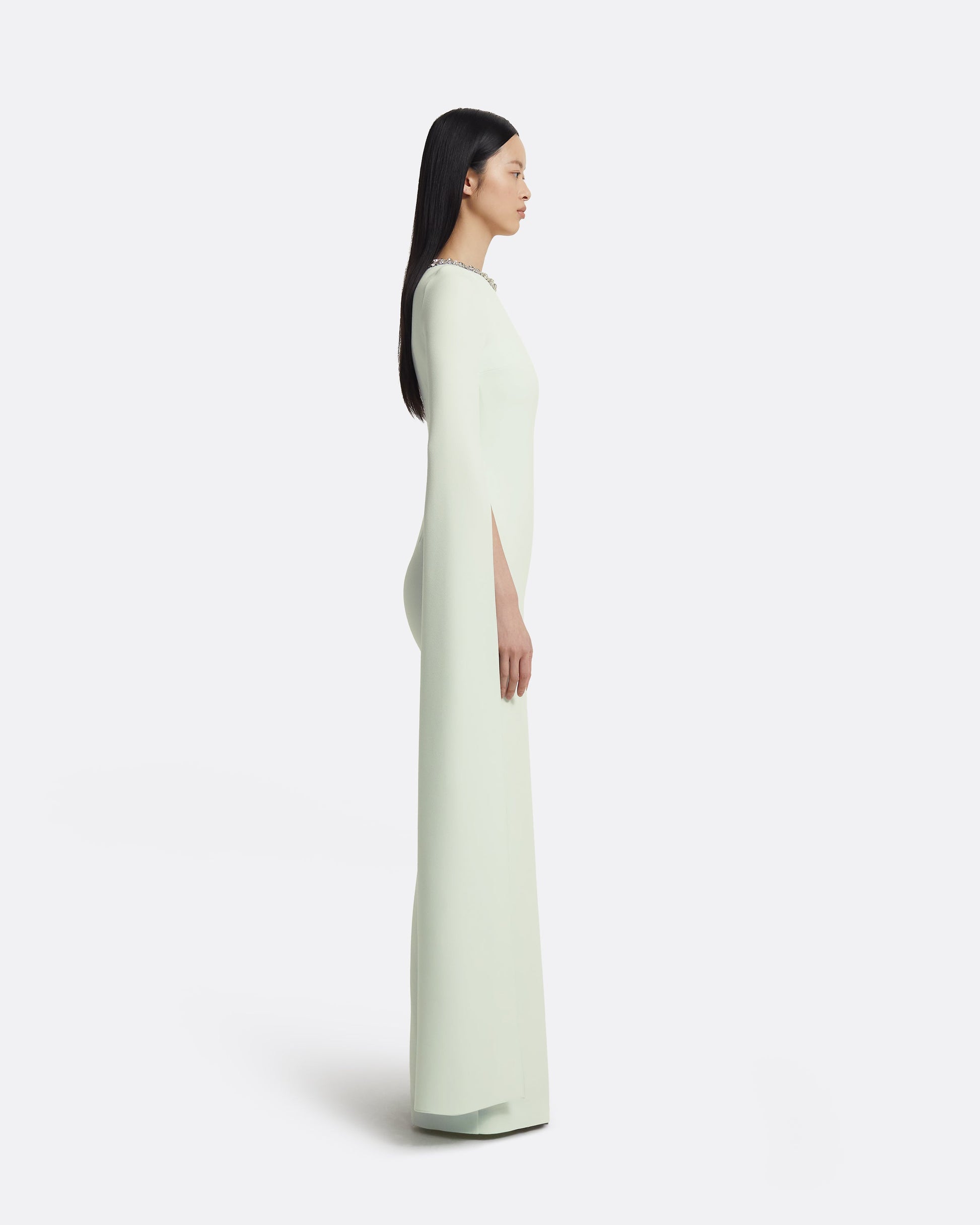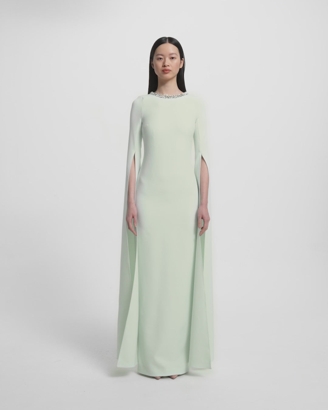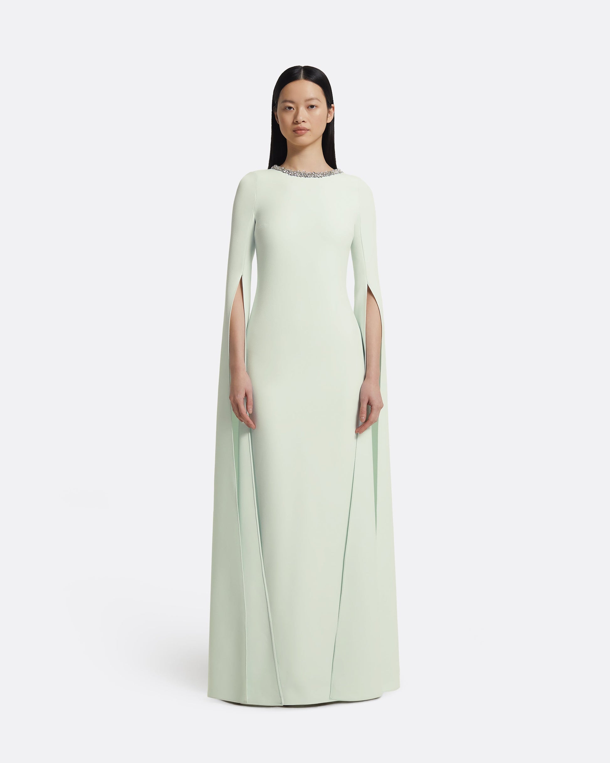 Gown with boat neck and split sleeve in spearmint Heavy Crepe with smoke/crystal Crystal Trim B embroidery.