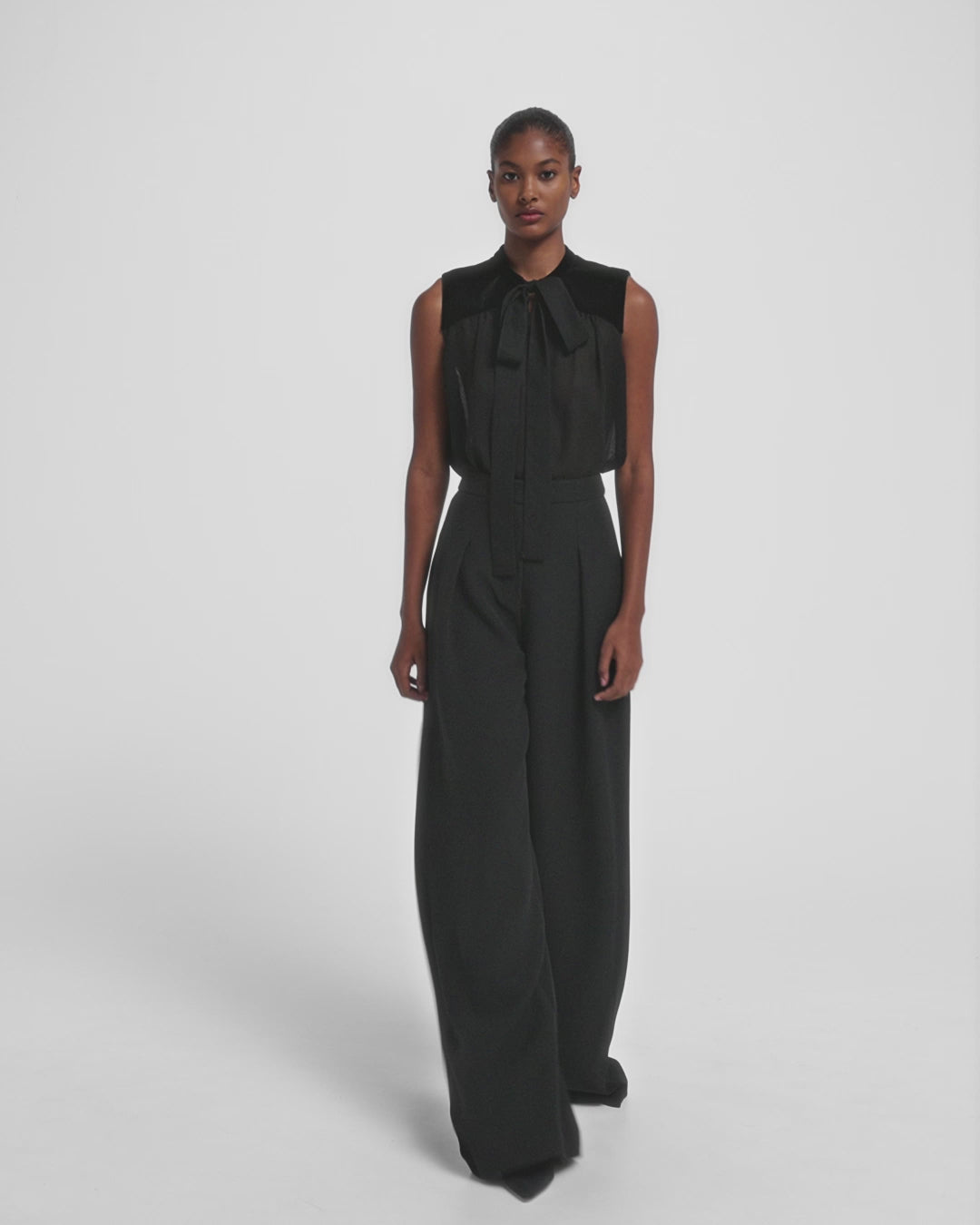 From the Resort ’26 collection, the Tally trousers in black bring ease and movement to evening dressing. Cut in a flared palazzo shape, the design is softened by a fluid drape and subtle tonal shine that catches the light in motion.
