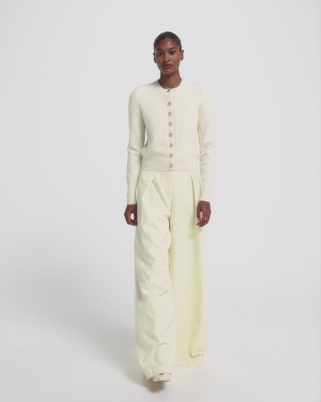 From the Resort ’26 collection, the Tanner trouser in buttermilk embodies ease with presence. Wide lines flow into a folded drape accent, giving the palazzo style a sculptural dimension.