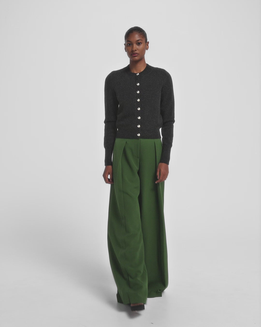 From the Resort ’26 collection, the Tanner trouser in moss green embodies ease with presence. Wide lines flow into a folded drape accent, giving the palazzo style a sculptural dimension.