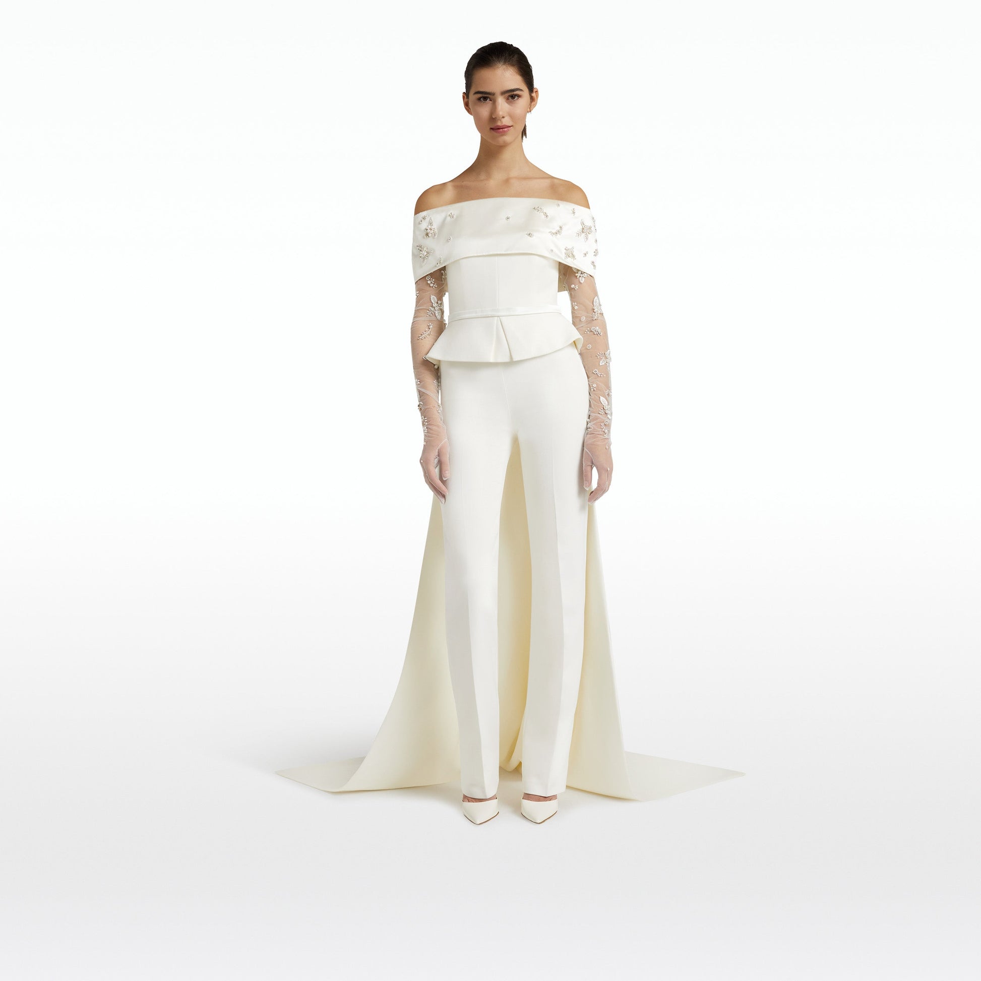 Off the shoulder, banded bustier top with train back detail and peplum in ivory Heavy Crepe and Silk Duchess, with Pearl Floral embroidery.