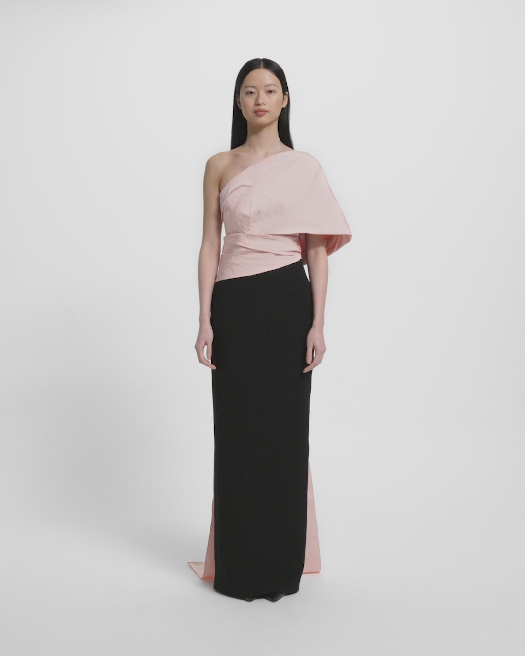 From the Autumn Winter ’25 collection, the Tokiyo gown in peony blush on black is a study in graphic elegance. Its asymmetric lines and sweeping drape create a silhouette that feels both sculptural and fluid.
