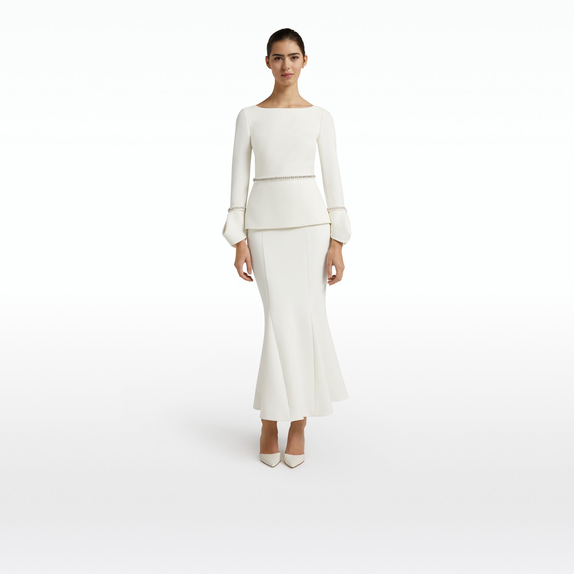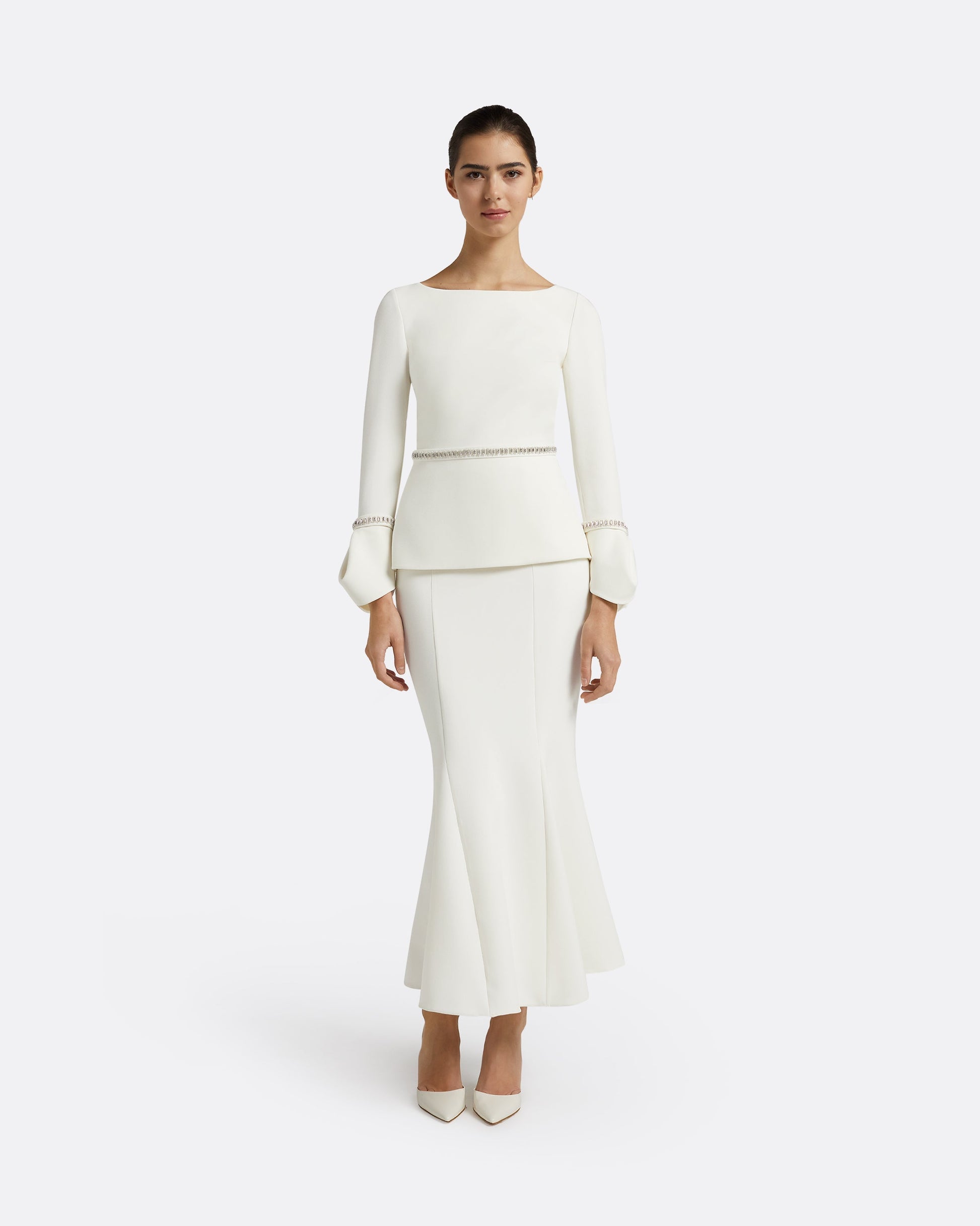 Boat neck, peplum top with tulip drape sleeve in ivory with crystal Jewel Ladder Trim.