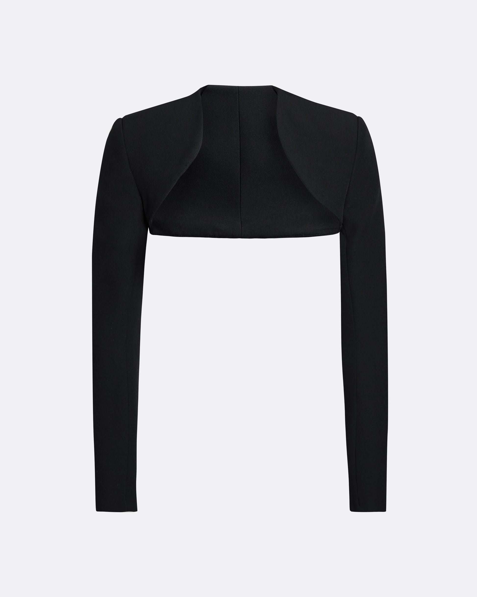 Long sleeved harness with curved neckline in black Heavy Crepe. Sold with a bustier jumpsuit with semi-flare leg.