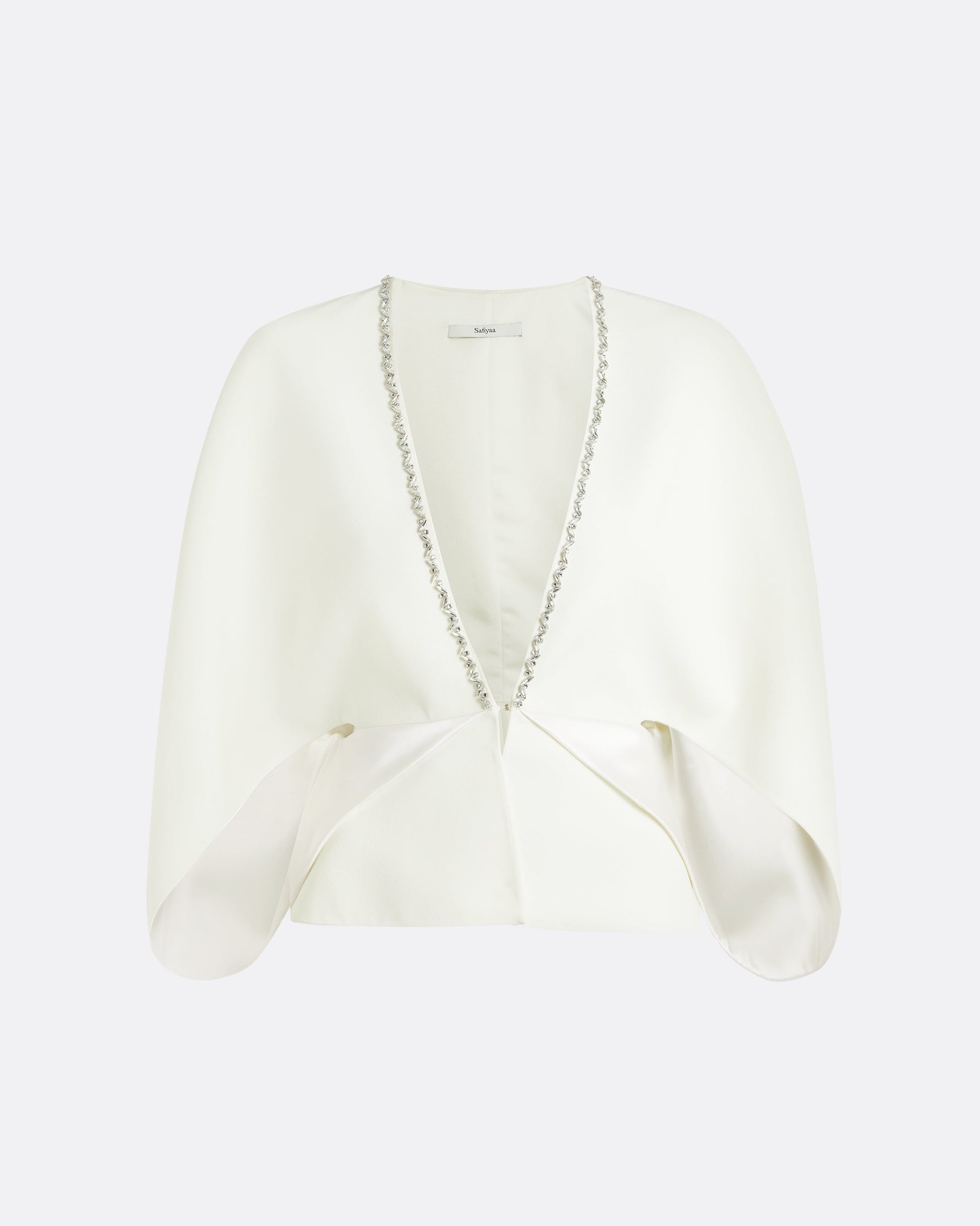 V-neck tulip cocoon jacket with contrast sleeve lining in ivory and Marquis Jewel Trim embroidery.