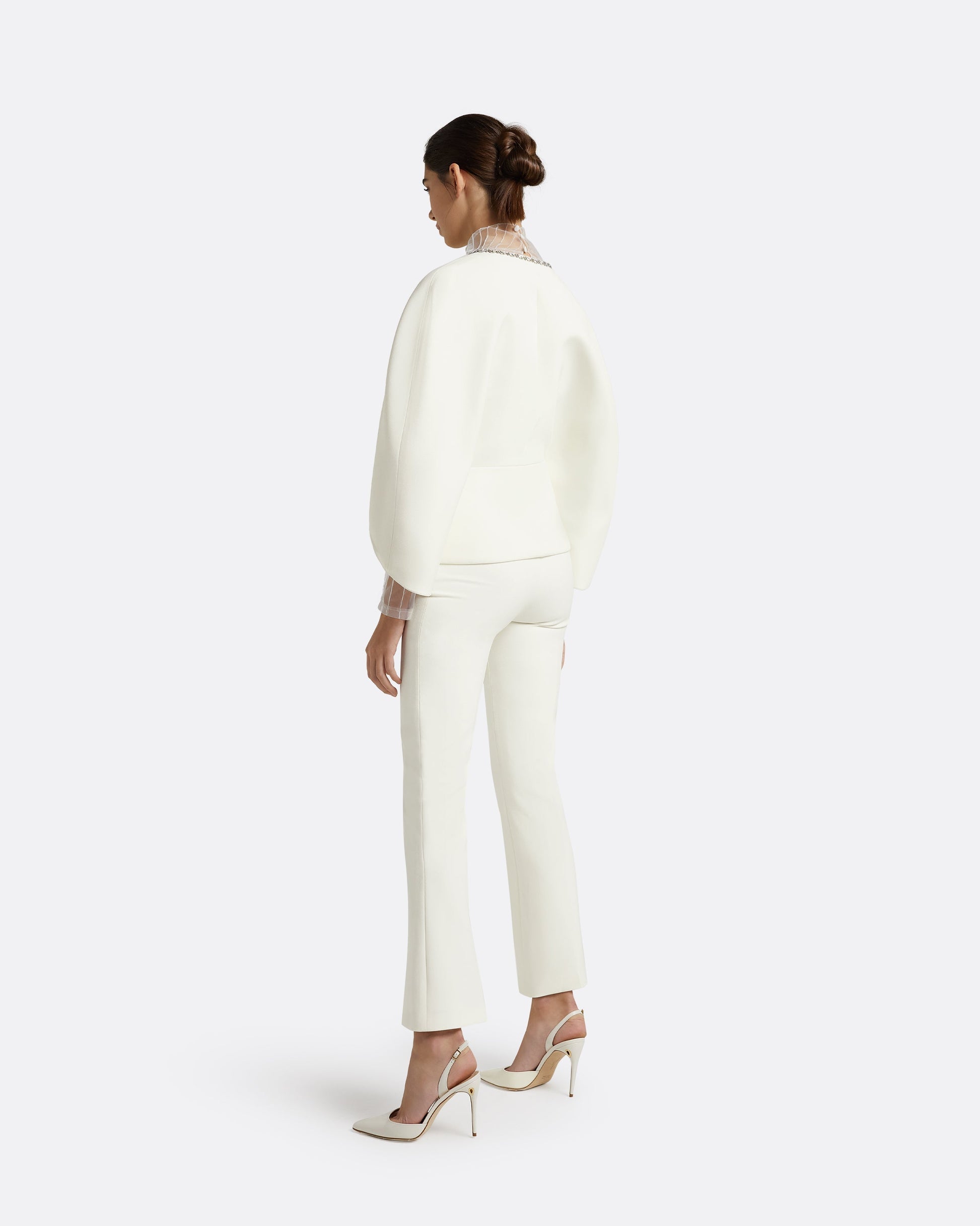 Styled with the Trace top and mari trousers in ivory. Fits true to size. Model is 175cm | 5'9'' and wearing a FR36 Heavy Crepe:92 % Polyester , 8 % Elastane Shine Satin Stretch:85% Polyester, 5% Lycra, 10% Acetate
