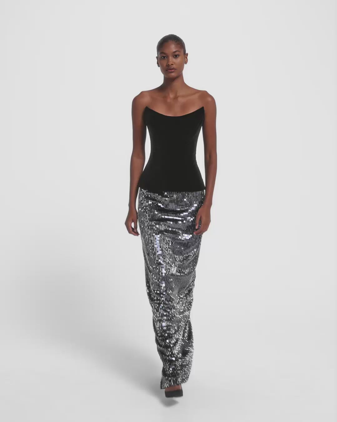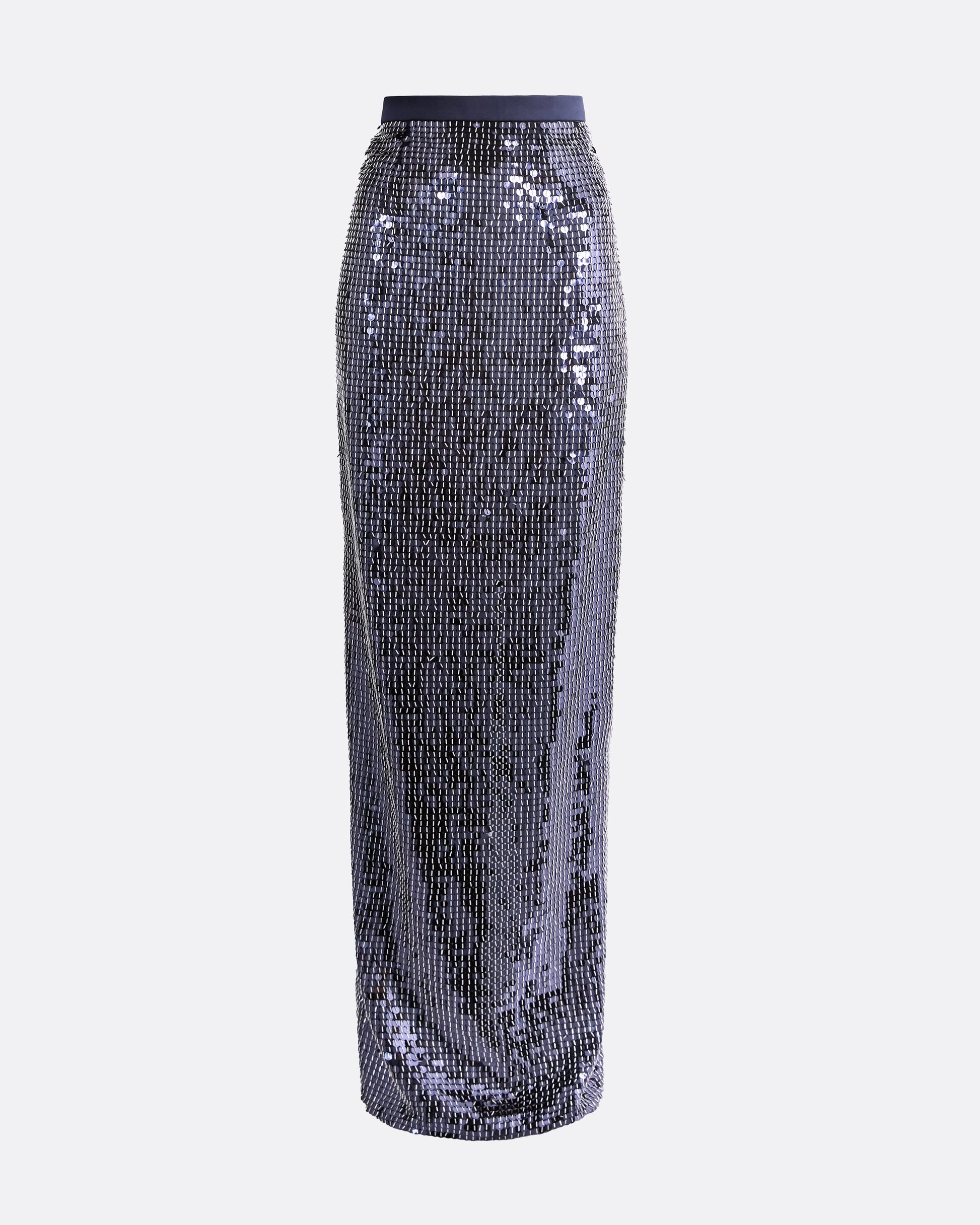 From the Resort ’26 collection, the Vick skirt in midnight navy catches the light with a sleek, elongated line. Embroidered in vertical silver sequins over a deep base, the column cut offers a sculptural counterpoint to its shimmering surface.