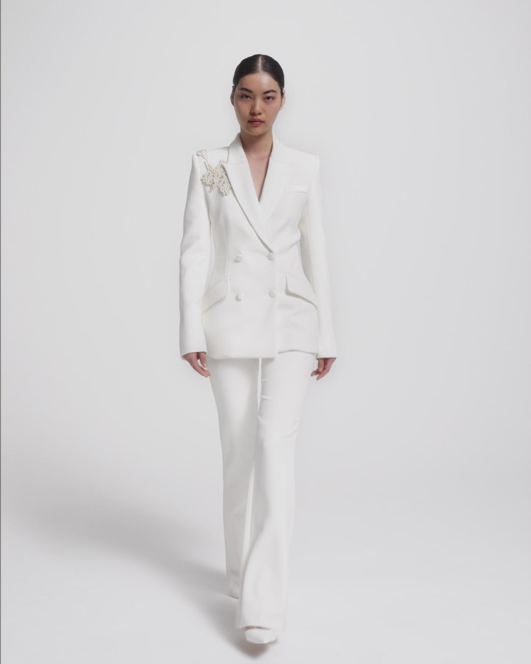 From the Bridal ’26 collection, the Wynnie jacket in ivory with pearl embroidery reinterprets classic tailoring with a sharp, modern line. Designed with clarity and proportion, it delivers structure with refined impact.
