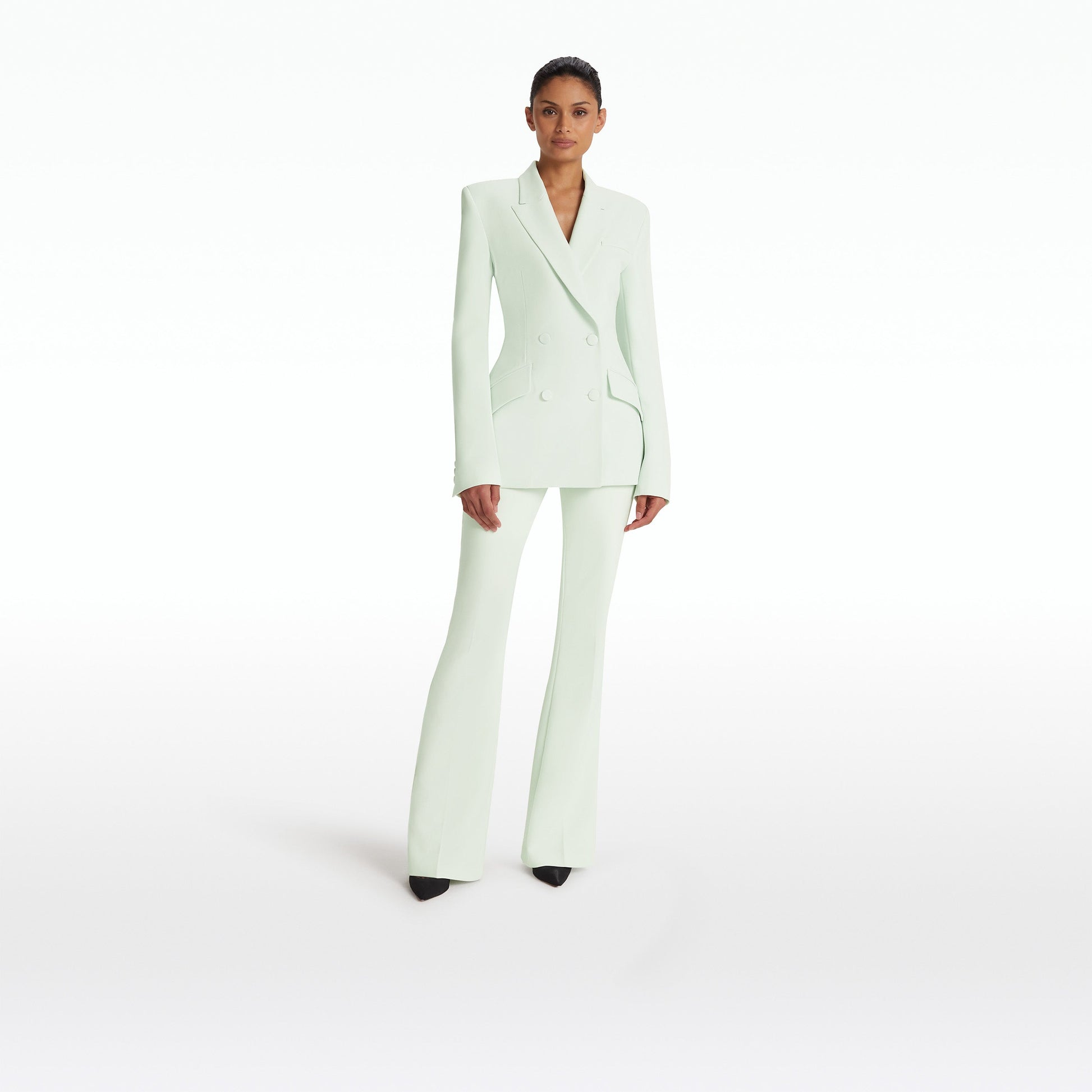 Classic tuxedo style jacket with tailored shoulders in spearmint Heavy Crepe.