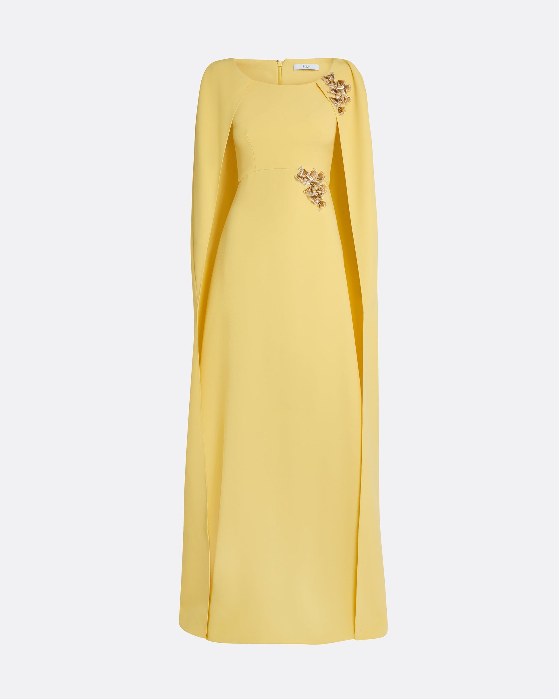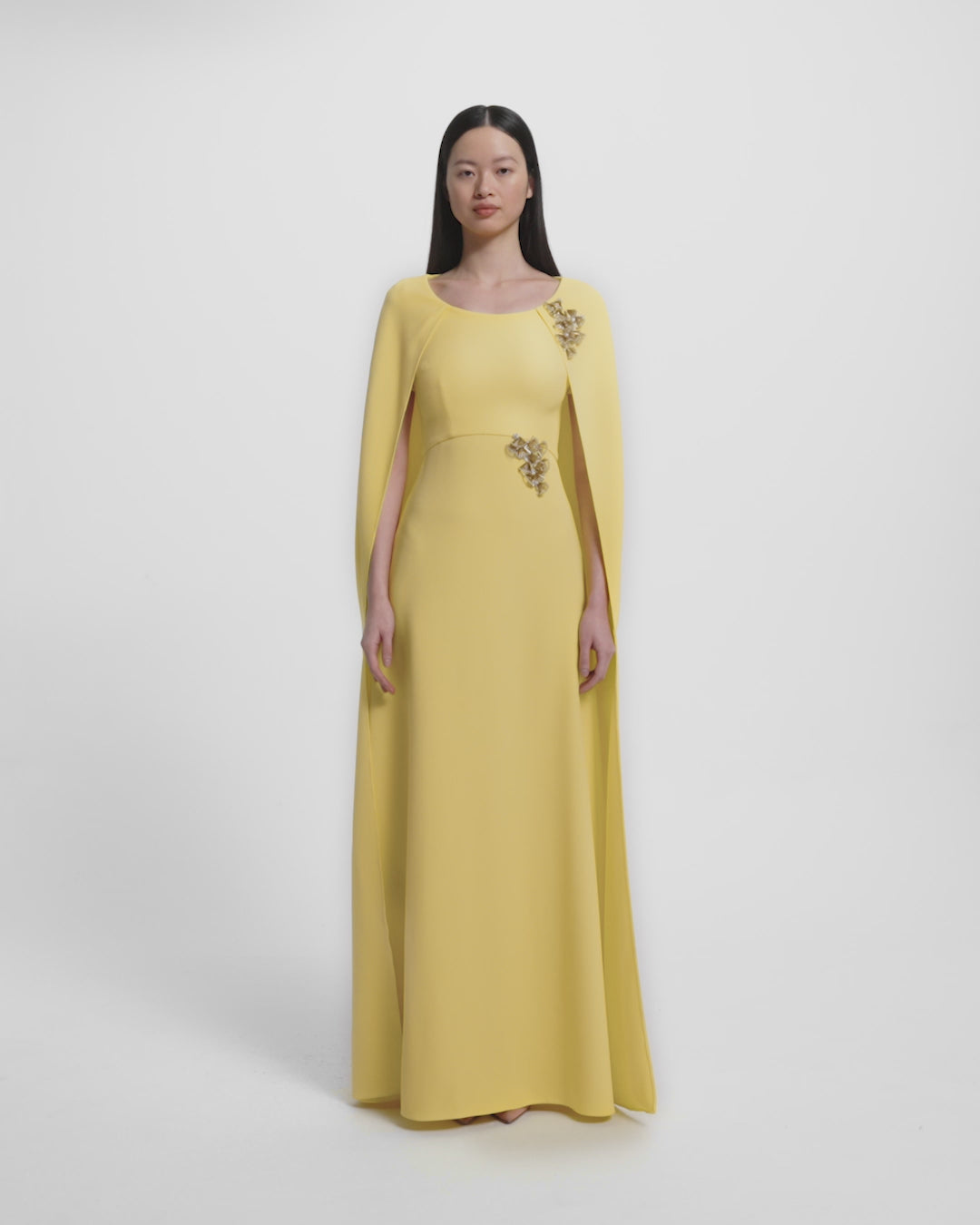From the Autumn Winter '25 collection, the Yuna dress in aspen gold is designed with poise and luminosity. A sweeping cape overlay lends sculptural motion, while the clean cut of the base creates a quietly commanding presence.